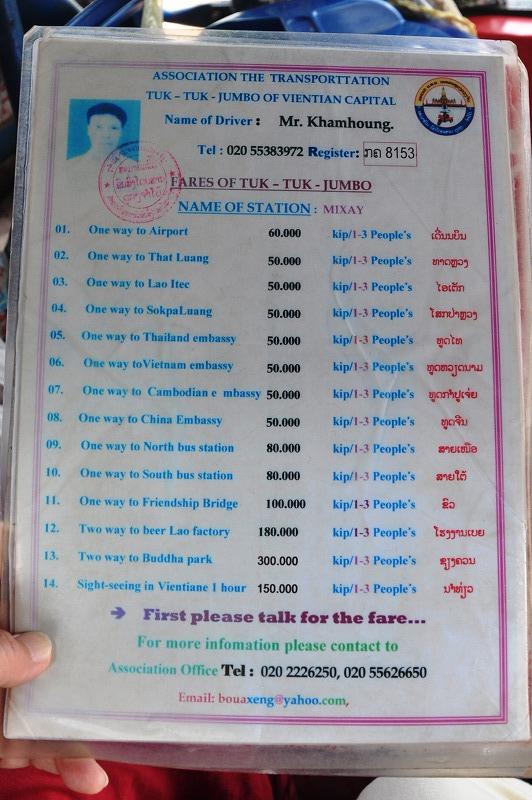 ビエンチャンでもっとも庶民的で、乗りやすい公共交通機関だろう。行先まで値段交渉をしなければならいのが、やや面倒だが、何回か乗ってほかの人が払う金額を見たりしているうちに相場が読めてくる。近距離だと、10000キップ、140円ほどだが、これは地元民価格。観光客は、仕方がないが、その2倍ほどを払うことになる。やや遠い観光スポットへ行くときは、3万、4万キップ。「10万キップ」などといわれたら、断るべき。ほかにたくさんのトゥクトゥクがいるので、気軽に次に声をかけよう。