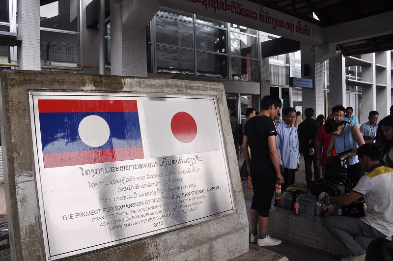 ビエンチャン市内中心部から6キロほど離れている。到着ロビー出口に「日本政府と日本国民の援助で空港拡張工事が進んでいる」と彫られた石碑があった。到着後市内へ行くには、タクシーが無難な乗り物だ。到着ロビーの出口にあるチケット売り場は半ば公認・正式窓口で、市内まで一律57000キップ。770円ほどだ。旅に出ると、念のため、それ以外のタクシーを拾えないものかトライしてみるのが常で、ここでもやってみた。公式窓口で57000キップを確かめた後、到着ロビーの外に出てしばらくうろうろしていたら、「市内まで、タクシー?」と声をかけられた。聞けば「50000キップでいい」という。680円ほどだ。領収書も書くというので、こっちを選んで乗った。結論は正解だった。予約した市内のホテルまでまっすぐ行き、20分ほどで到着。50000キップを払うと、印刷された領収書用紙に金額を書いて渡してくれた。同時に、「滞在中、必要ならここに電話を」と名刺をよこした。なるほど、7000キップ割安なのは、後日の営業をもくろんでのことだったのか。でも、これって正当な行為だな。