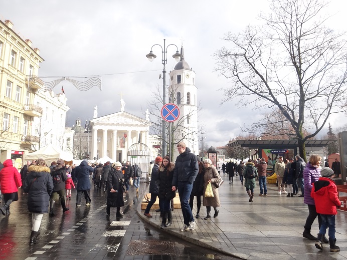 ヴィリニュスの旧市街にある広場です。夜明けの門からだと、夜明けの門通りを進むと左側に市庁舎広場があり、そのままピリエス通りを抜けるとカテドゥロス広場に突き当たります。王宮と大聖堂があって、見応えのある広場です。