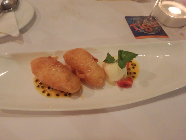 かりっと揚げたバナナフリッターにバニラアイスとパッションフルーツソースをつけて。