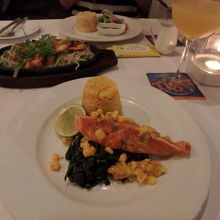脂の乗った大きなサーモン、おいしかったですがそれよりも日本では高いほうれん草がたっぷりあったのがうれしい♪