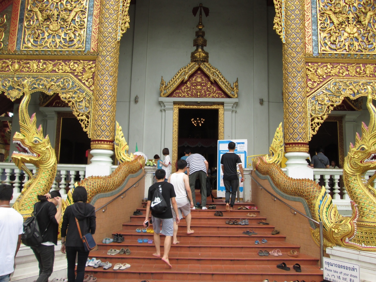 ワット プラシンのメインゲートを通り抜け最初に現れる大きな建物が本堂です。まず、入口の前面に施された繊細な装飾が目を引きました。また、入口には蛇の頭を持つ蛇神「ナーガ」がいて、タイ北部のランナー様式の寺院らしい特徴がありました。