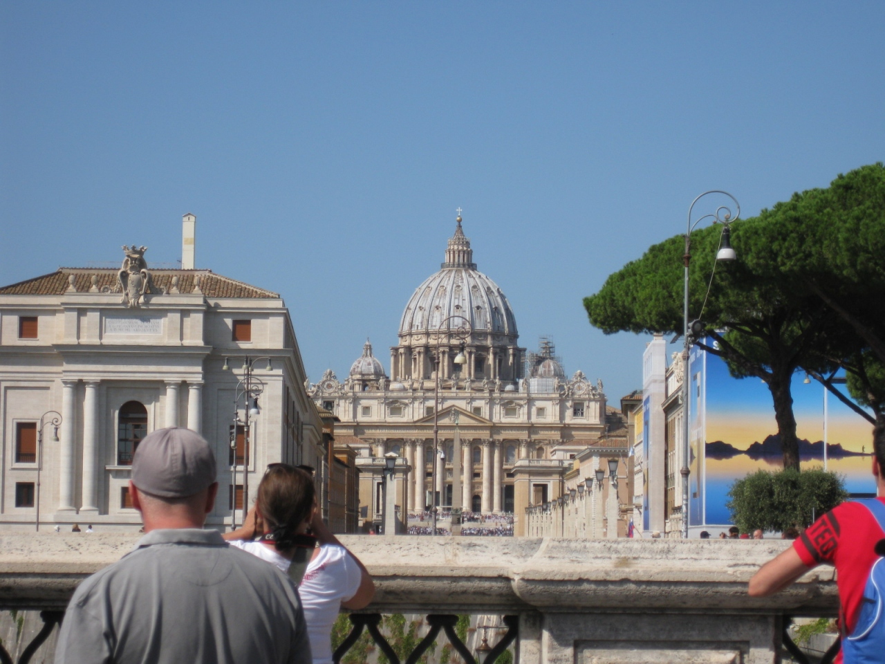 天使像と奥に見えるサンタンジェロ城の構図は絵になります。やはり絶好の写真撮影スポットだけあって、写真を撮る人でいっぱいでした。お城に向かって左手にはサン・ピエトロ大聖堂も良く見え、こちらも写真を撮っている人が多かったです。