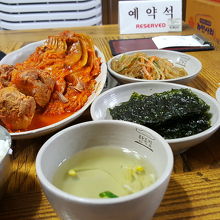 一人で行ってみました。お昼時をズラしたつもりでしたが店内は賑わっていました。一人だと伝えると、大丈夫なのか予約席へ座るよう指示されました。アジュンマから「キムチチム?」と聞かれ「ネー」と答えると、すぐパンチャンが並べられました。