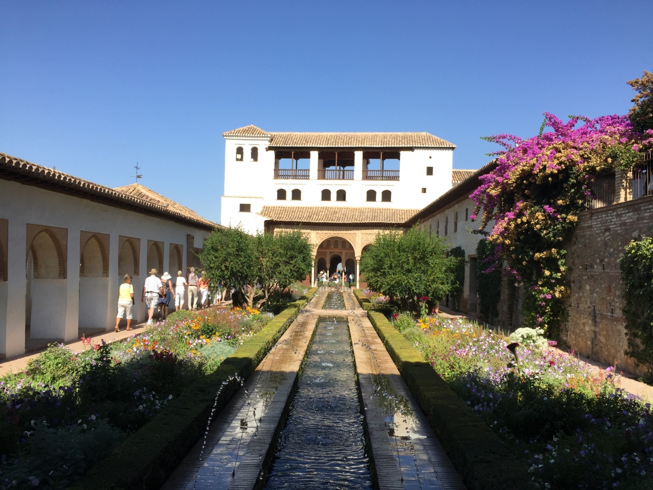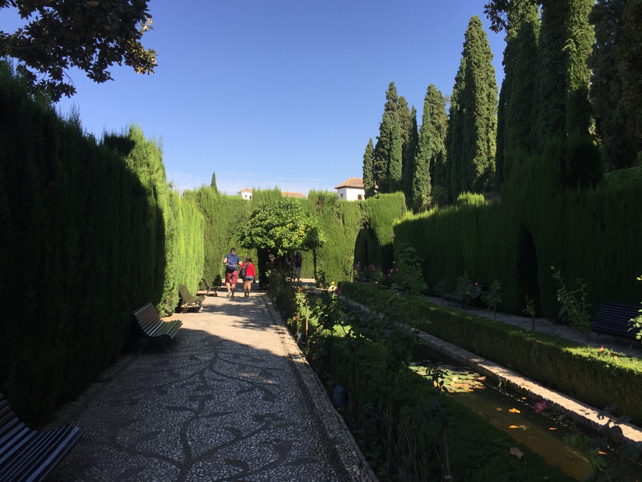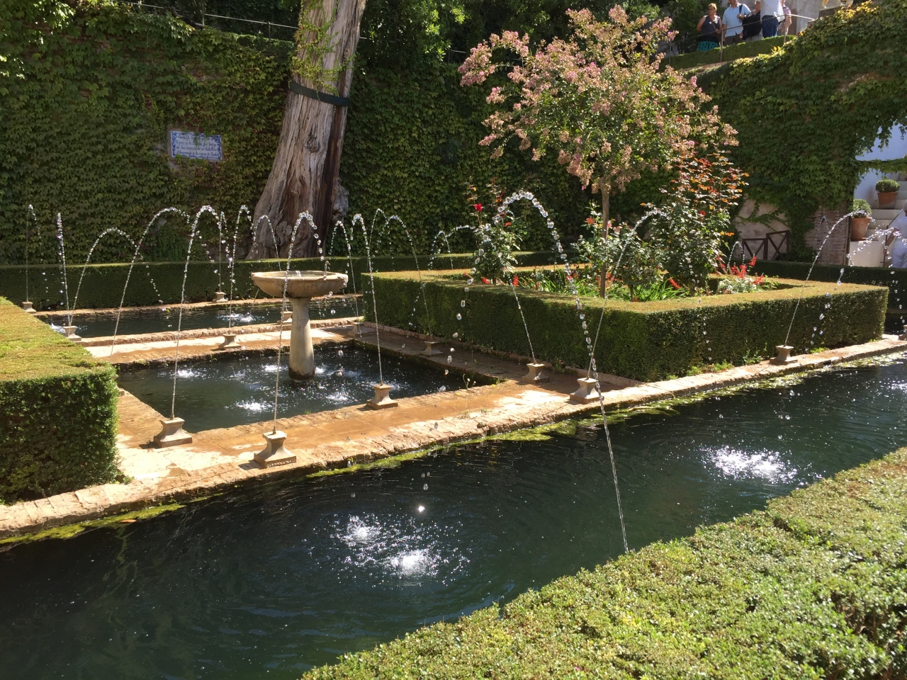 アルハンブラ宮殿を見学した後、城塞の壁に沿って庭園へ。花や気で飾られた門から入りました。水音が生かされた、水と緑の庭園という感じです。庭園には当時から噴水があり。噴水から放出した水が綺麗なアーチを作っている様子が見れます。用事の文化水準が見れるのではないでしょうか。