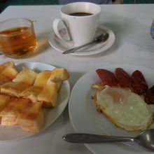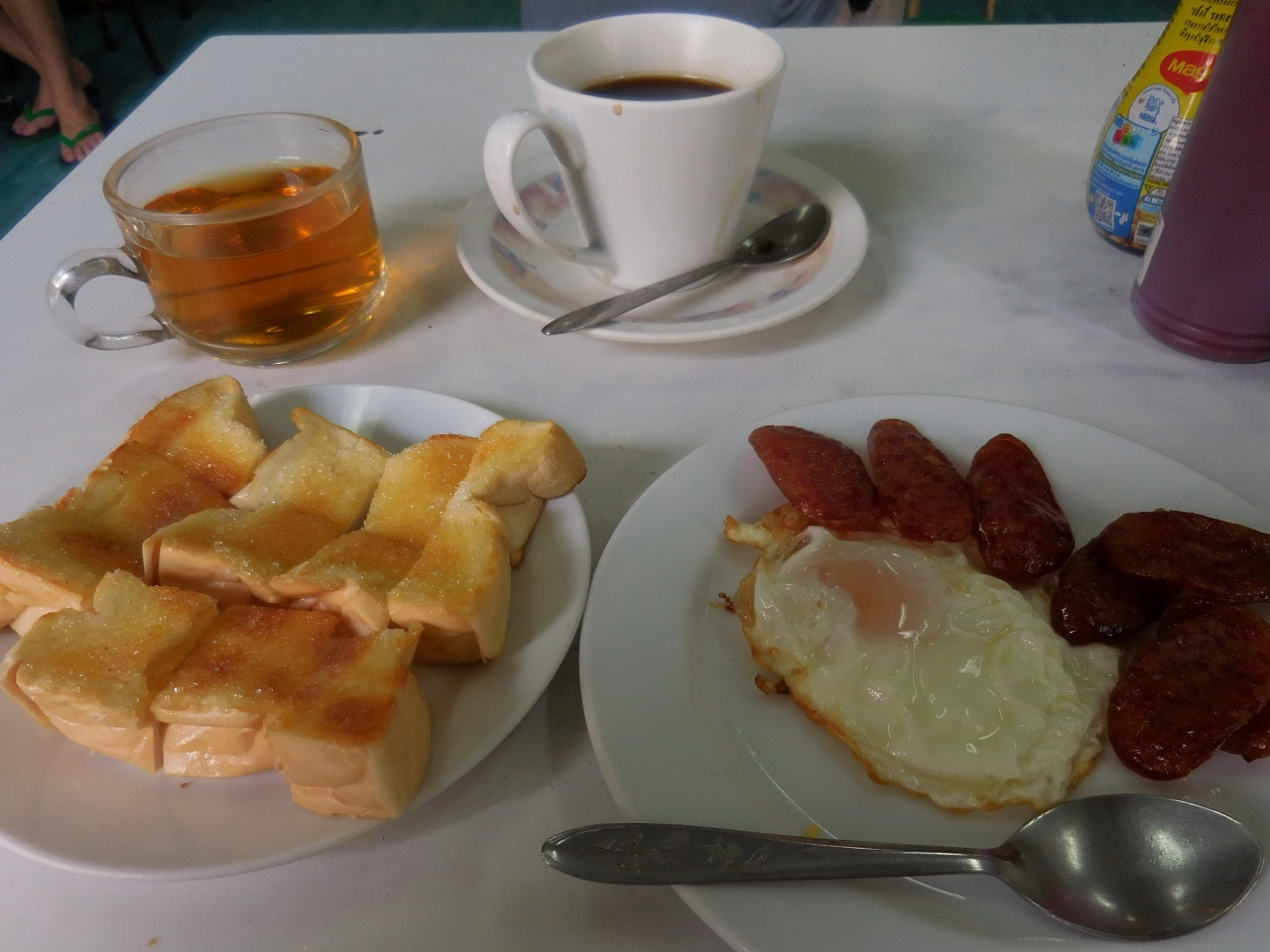 目玉焼き1個とチャイニーズソーセージ、砂糖をかけたバタートースト、ホットコーヒーで95Bでした。砂糖をかけたトーストなんて子供の頃以来、懐かしい味ですね。いやぁおいしかった。