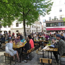 市庁舎の前に広がっている。ベンチとテーブルが置かれて飲食が出来、市民のコミュニケーションの場にもなっているようだ。訪ねた時には多くの人で賑わっていた。市庁舎を観光で訪ねる人もここでくつろぐことが出来る。