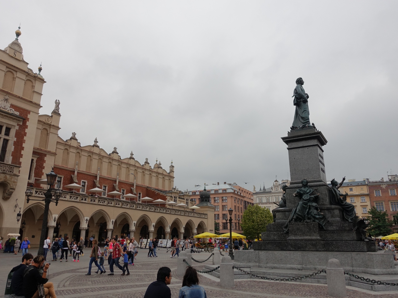 クラクフの「中央広場」は、観光の基点となる場所です。クラクフ最大の見どころである「聖マリア教会」もこの広場に面して建ち、たくさんのお店が集まる「織物会館」もこの広場の一画にあります。