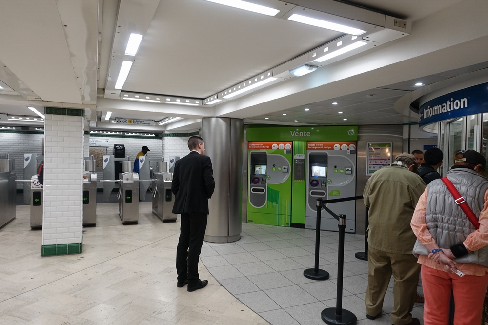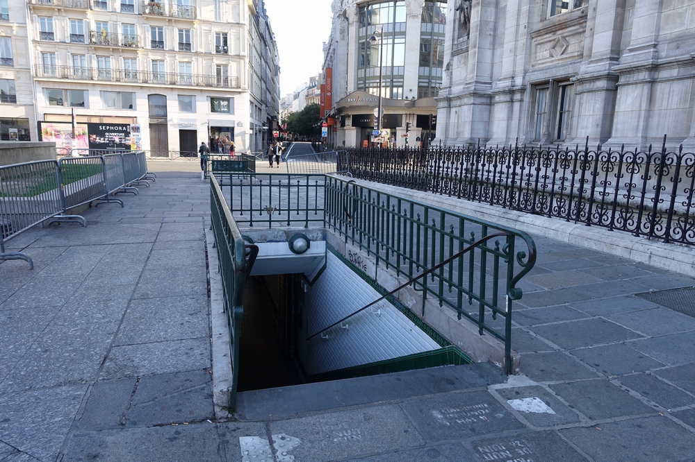 市役所前(の地下)にあるのがオテル ド ヴィル駅。メトロ1号線と11号線が通っています。1号線に乗ってきて当駅で下車しましたがホームドアが設置されていました。日曜の朝のため人は少なめでした。