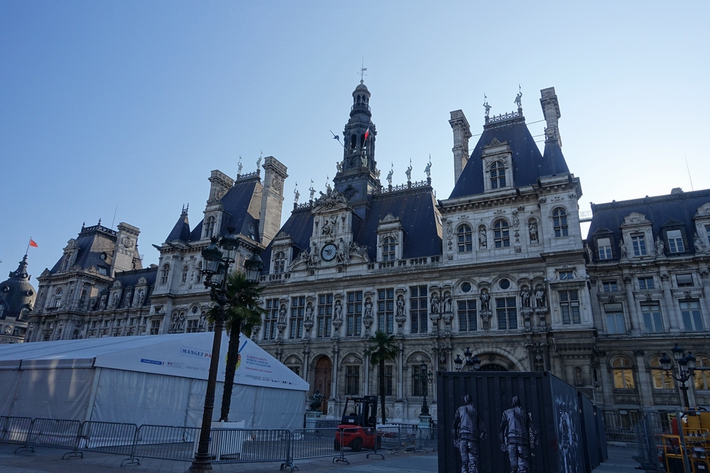 地上出口はオテル ド ヴィル広場の北やリヴォリ通りに何か所かあります。地上を出るとすぐ市庁舎が見え、市庁舎を見てからセーヌ川を渡りノートルダム大聖堂まで歩きました。