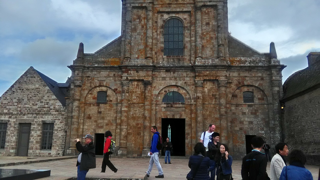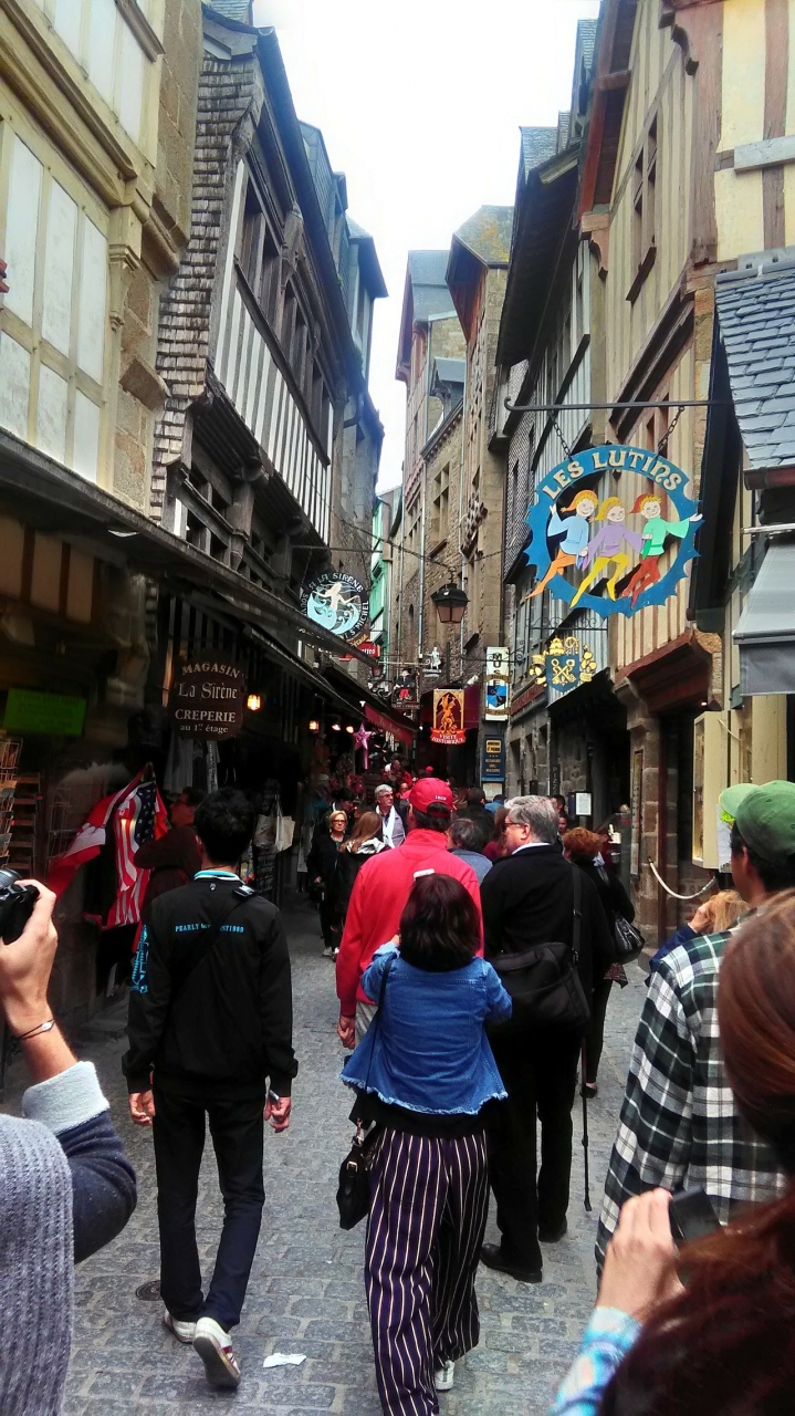 そして島内に入るとすぐ両側にレストランや土産物屋が並ぶ狭い石畳の道を観光客が埋め尽くすグランド・リュと呼ばれるメインストリートがあり、そこを抜け修道院に入っていきます。