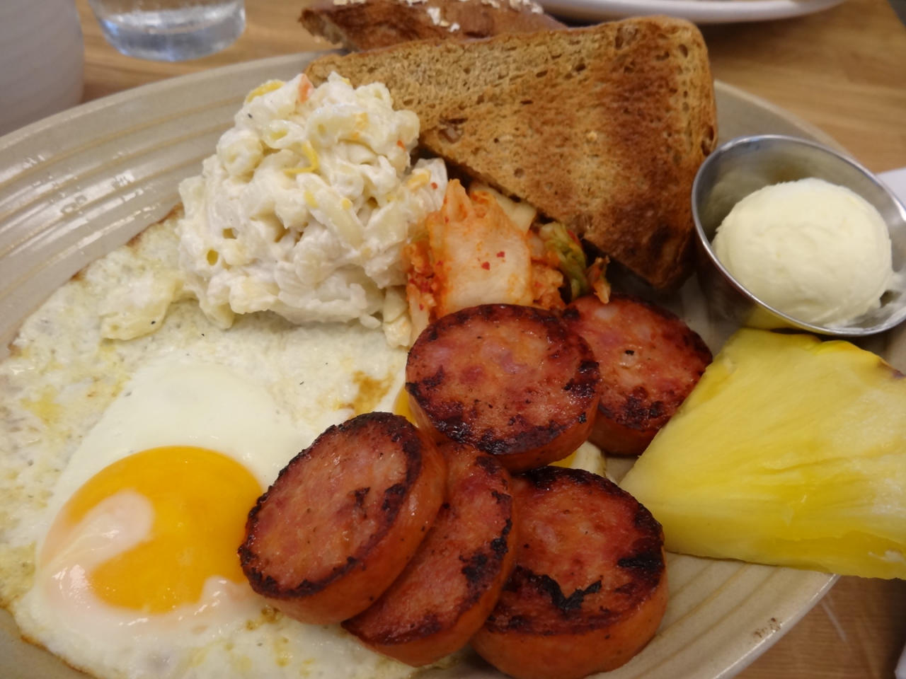 たまご、ソーセージ、パンと言うスタンダードなやつ。