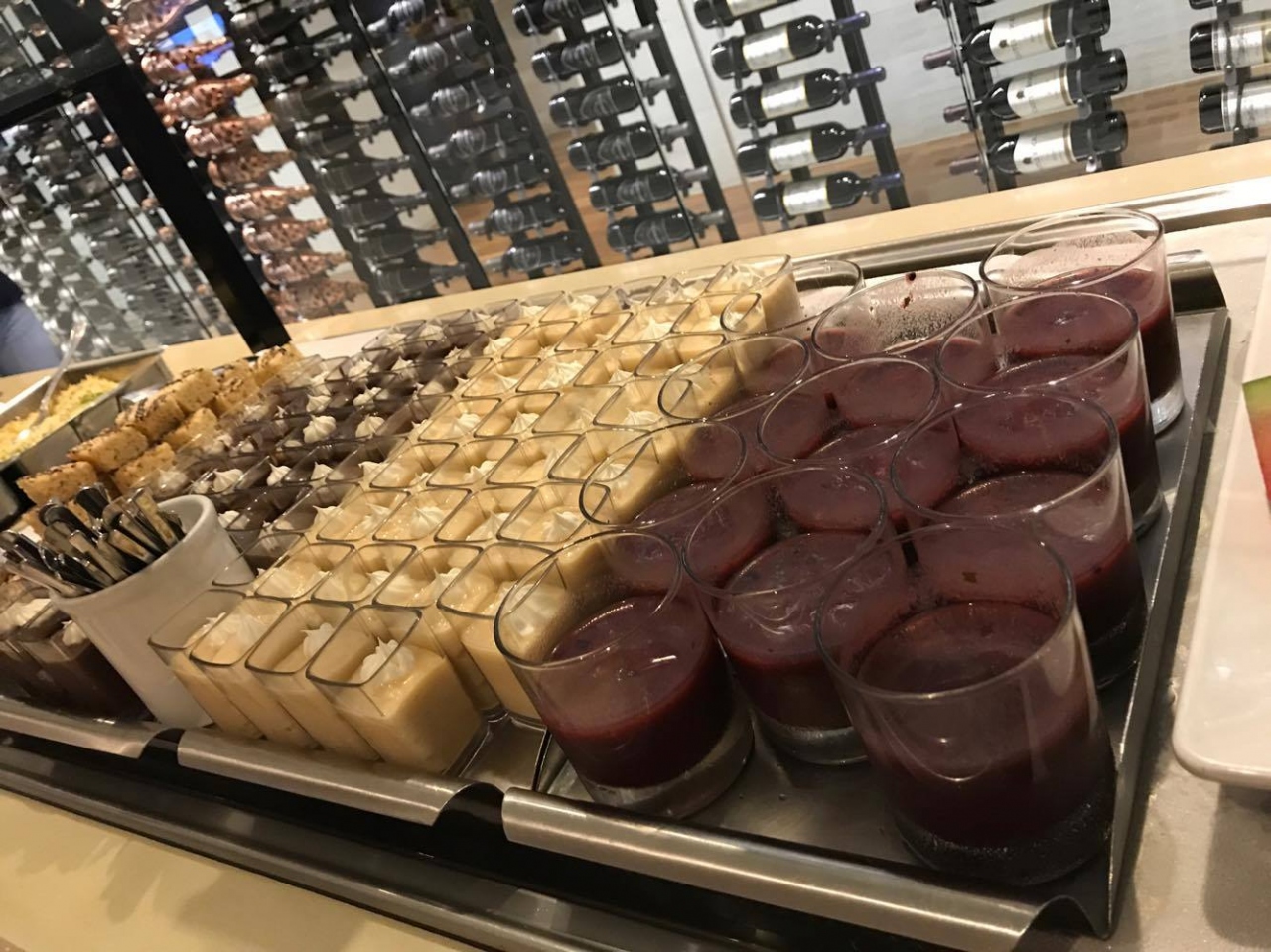 料理の種類も、北米のスタアラ系ラウンジでは群を抜いて種類が多く、ホットミール各種、サラダも数種類、アジアンヌードルも日替わりで用意されています。また、ベリーとスパイスのスムージーなど変わった飲み物も用意されていたり、ビール、ワイン、スパークリングワイン等も一通りそろえられていますし、バーカウンターにはバーテンダーもいるのでちょっとしたカクテルや、生ビールも頼めます。午前中の便だったのでブラッディマリーが良く出ていました。私もトライしましたがアルコール強めでした。