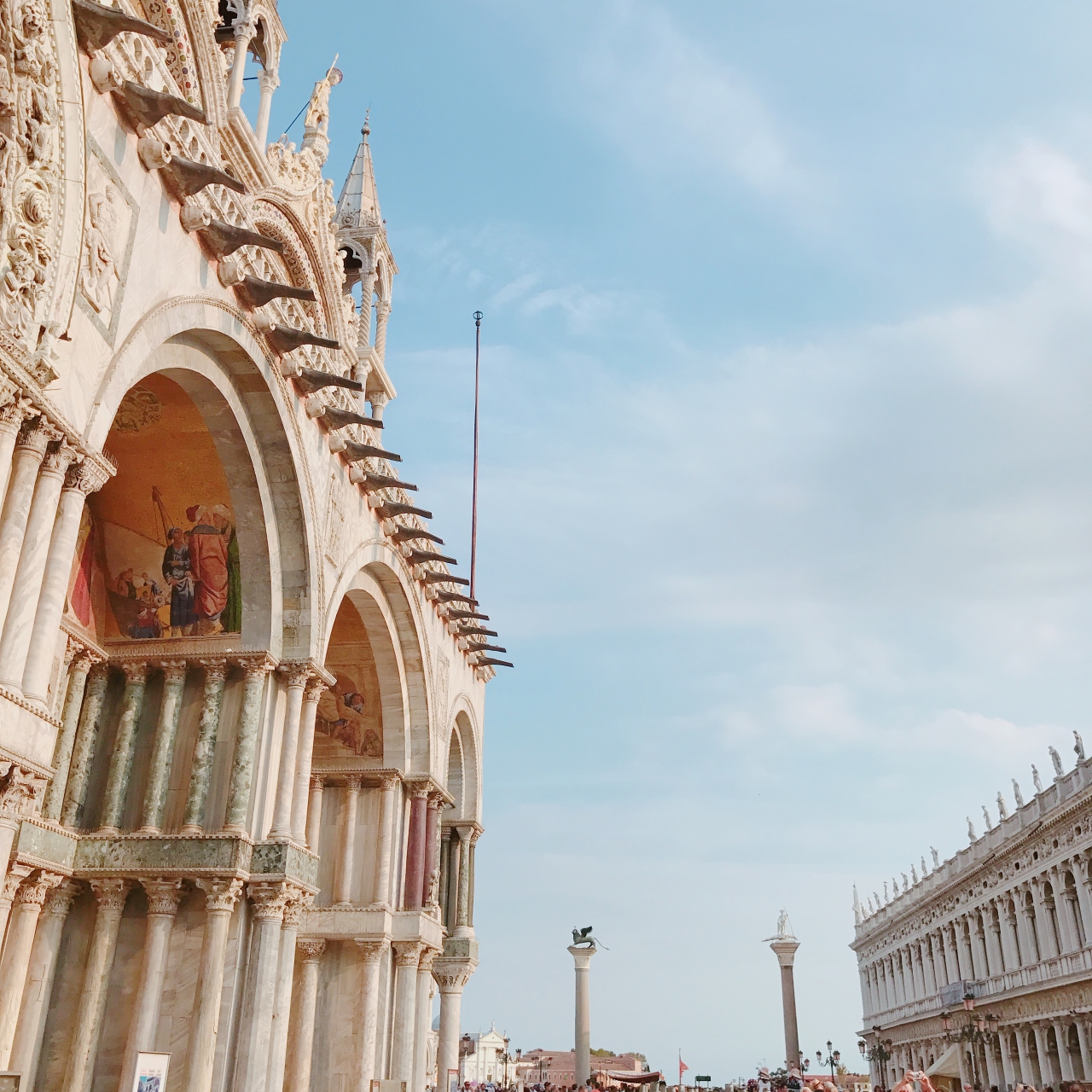 サンマルコの大広場と小広場があるんですね。小広場は運河につながる道ですね。このあたりはベネチア最大の観光地なので人がたくさん集まっていて活気であふれています。運河に向かって2本の円柱が建っています。1本はライオン、もう片方は守護聖人です。