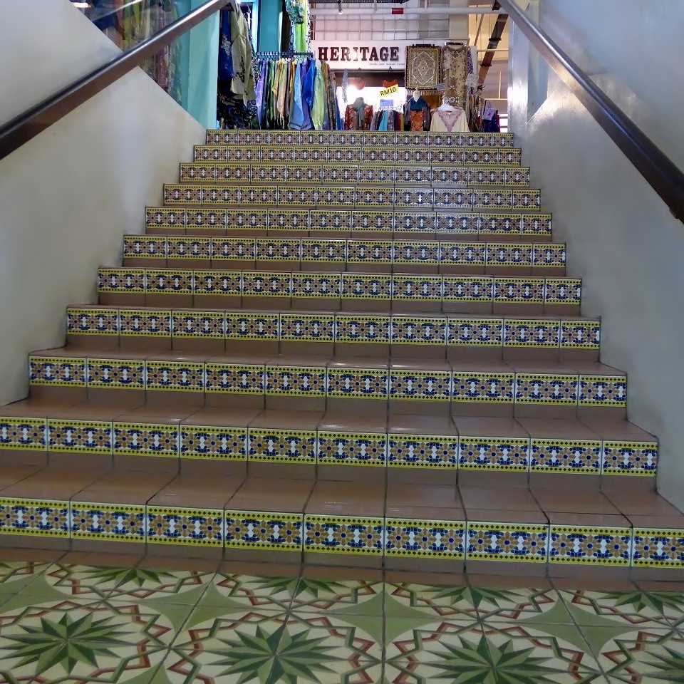 2階建ての建物に、よくあるお土産屋さんにエキゾチックな雑貨屋さん、フードコートがバランスよく並んでいます。シンガポールのアラブストリートあたりのお店が屋内に集合したイメージでしょうか。階段や床のタイルが綺麗な模様を描いていて、さすがイスラム美術と感心しました。