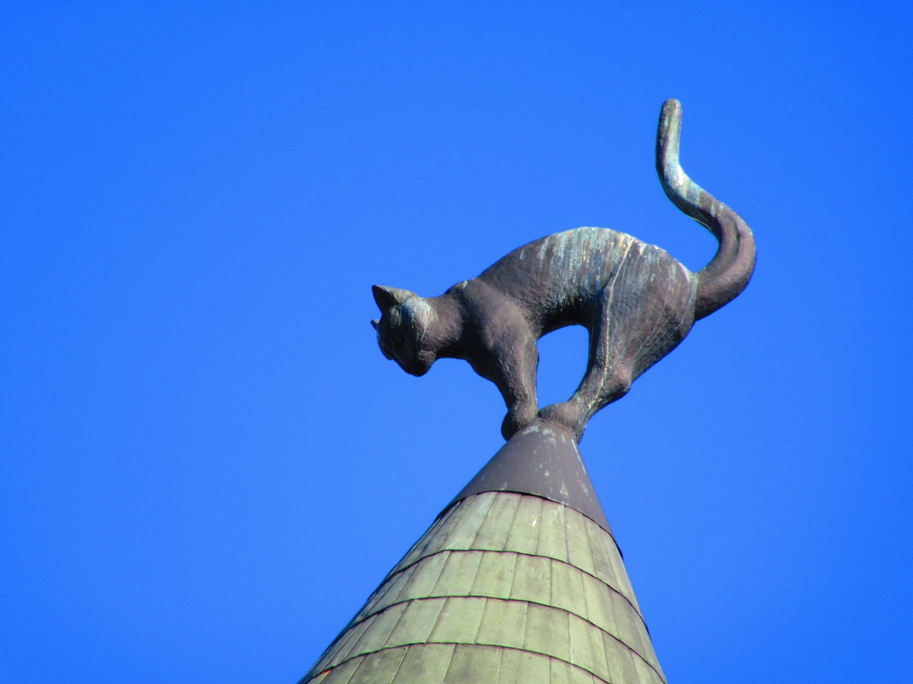 リーヴ広場の北側にある「猫の家」はなかなか分かりずらい場所にあります。屋根の上の猫も小さいので、建物の真下からでは見る事はできません。