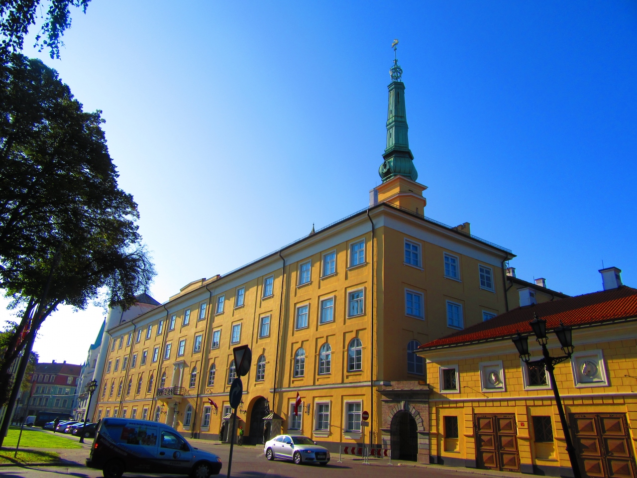ダウガヴァ川沿いに建つ、黄色い外壁のこの城は現在、大統領官邸として使われています。入り口には警察官や衛兵などが立っていました。大統領官邸なので警備は頑丈です。