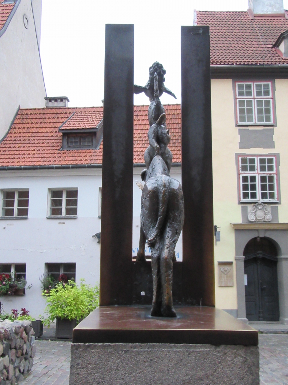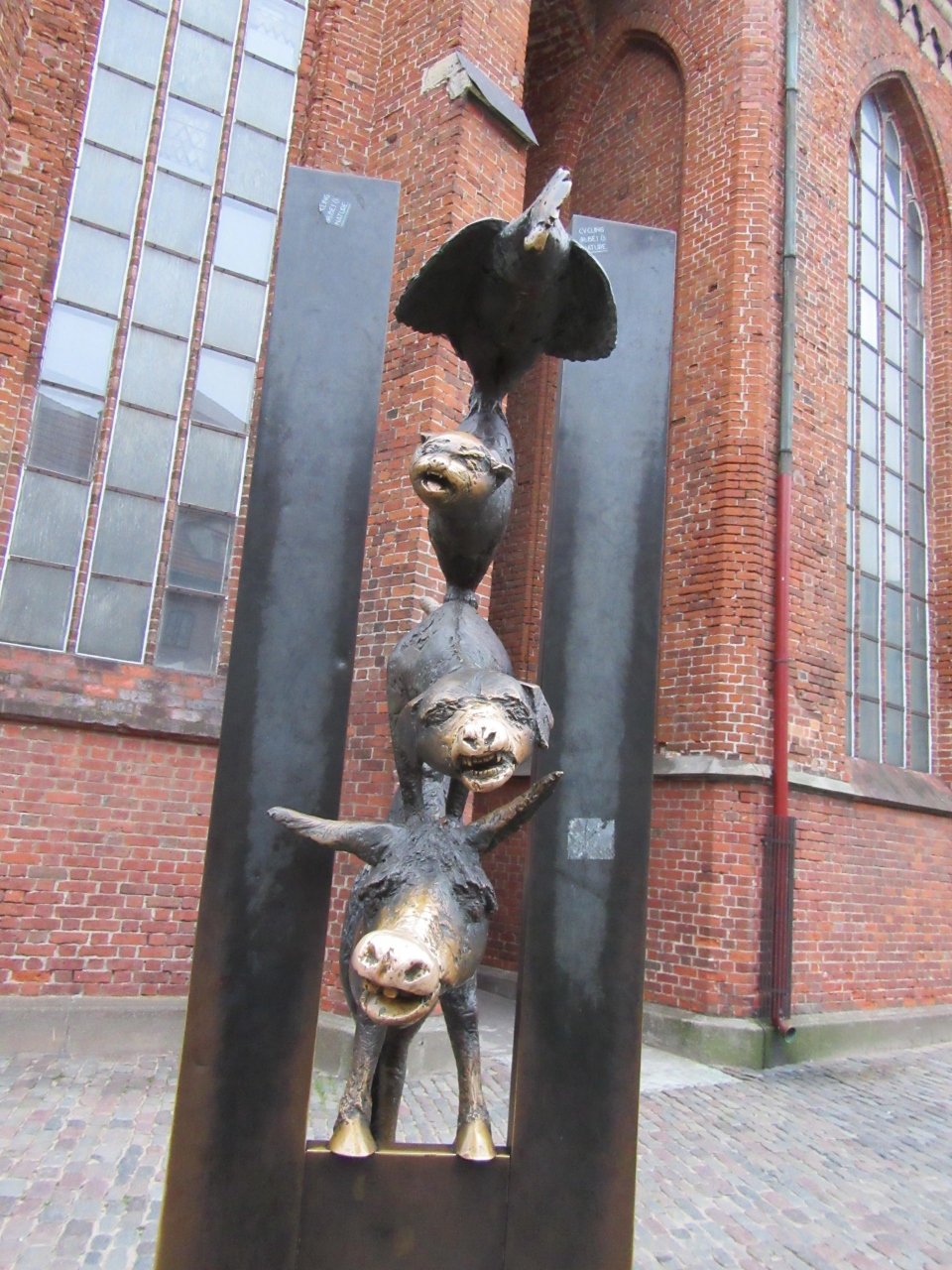聖ペテロ教会の敷地の一角にブレーメンの音楽隊の像はあります。観光名所だけあって、日中はまともに写真も撮れないくらい賑わっています。