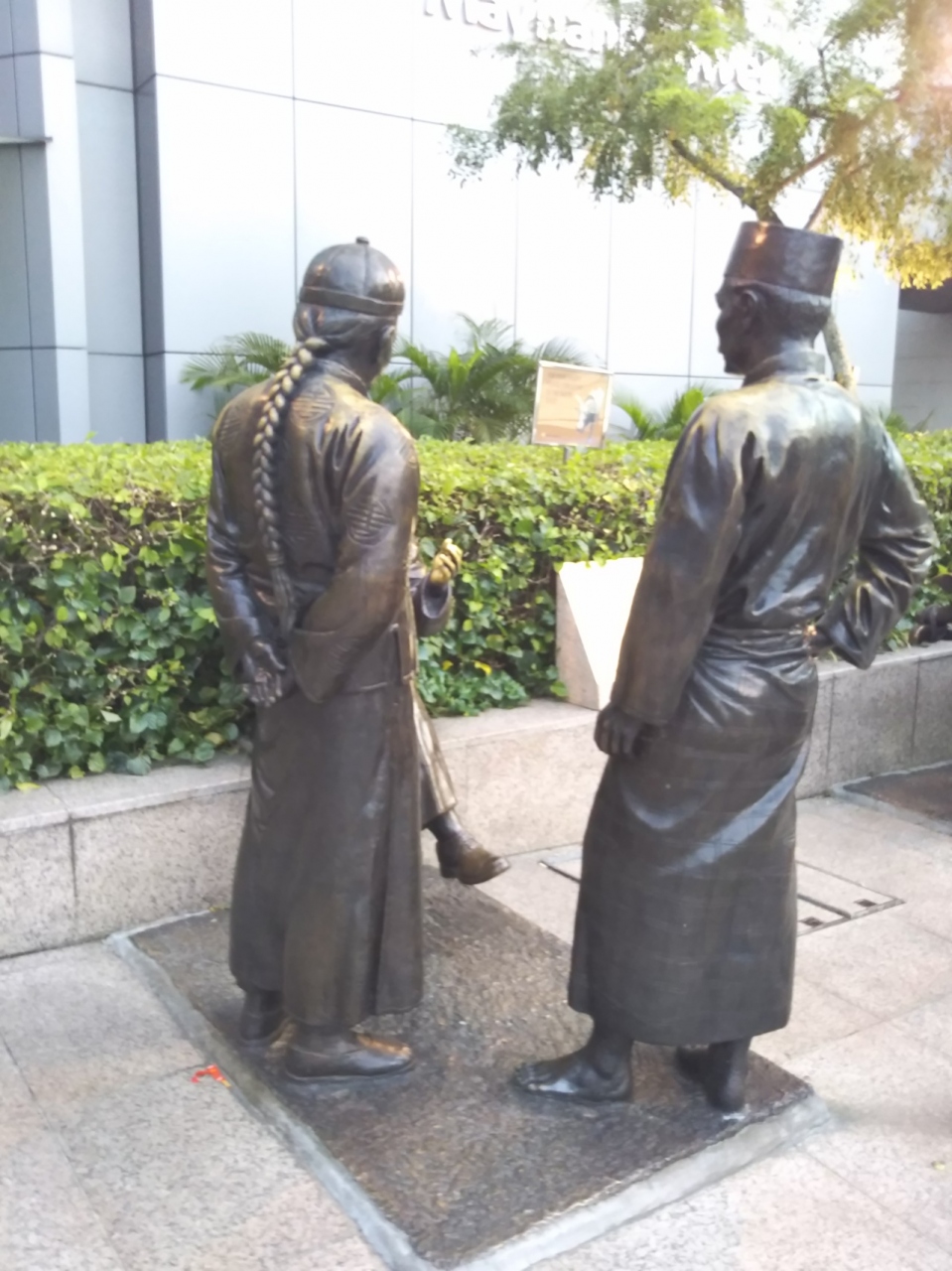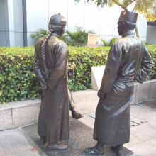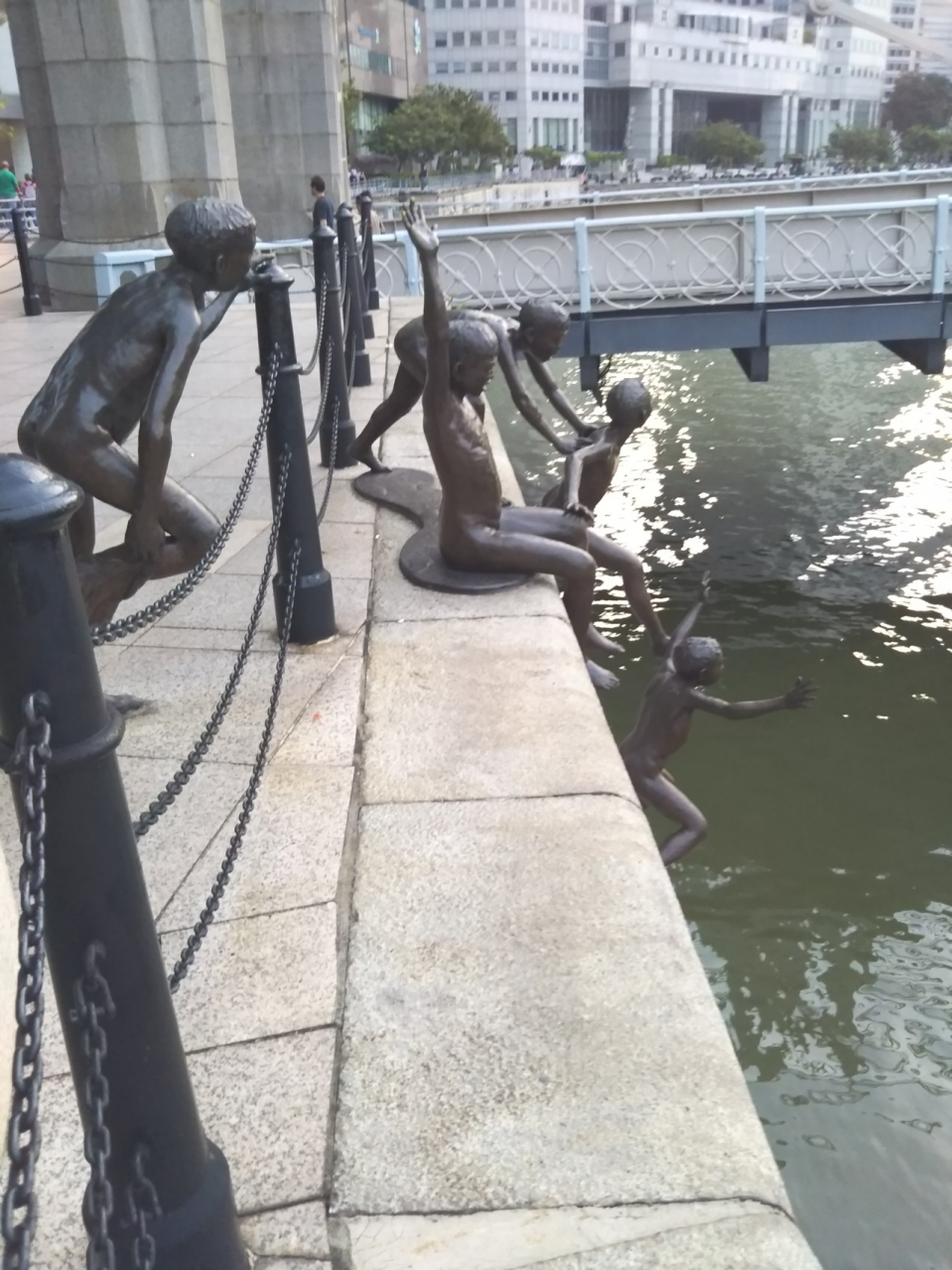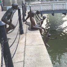 ズボンを脱ぎながら川に飛び込もうとしている少年たちの像が、