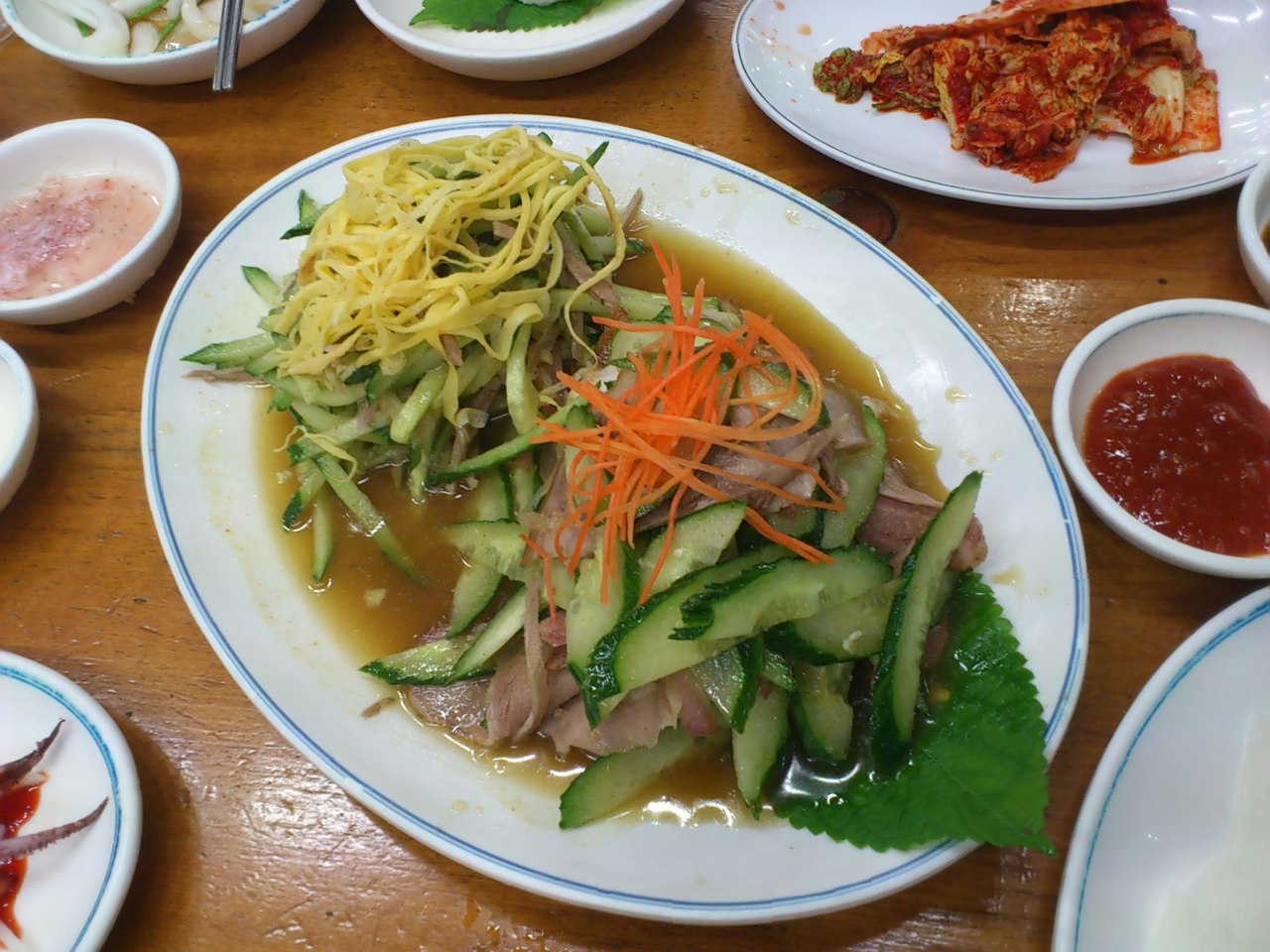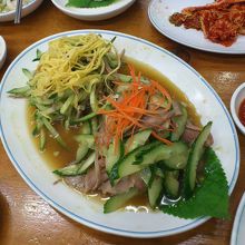 冷菜チョッパルはチョッパルに、キュウリ、卵焼き、クラゲなどを千切りしカラシと酢の効いたタレであえてます。