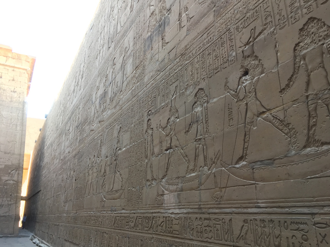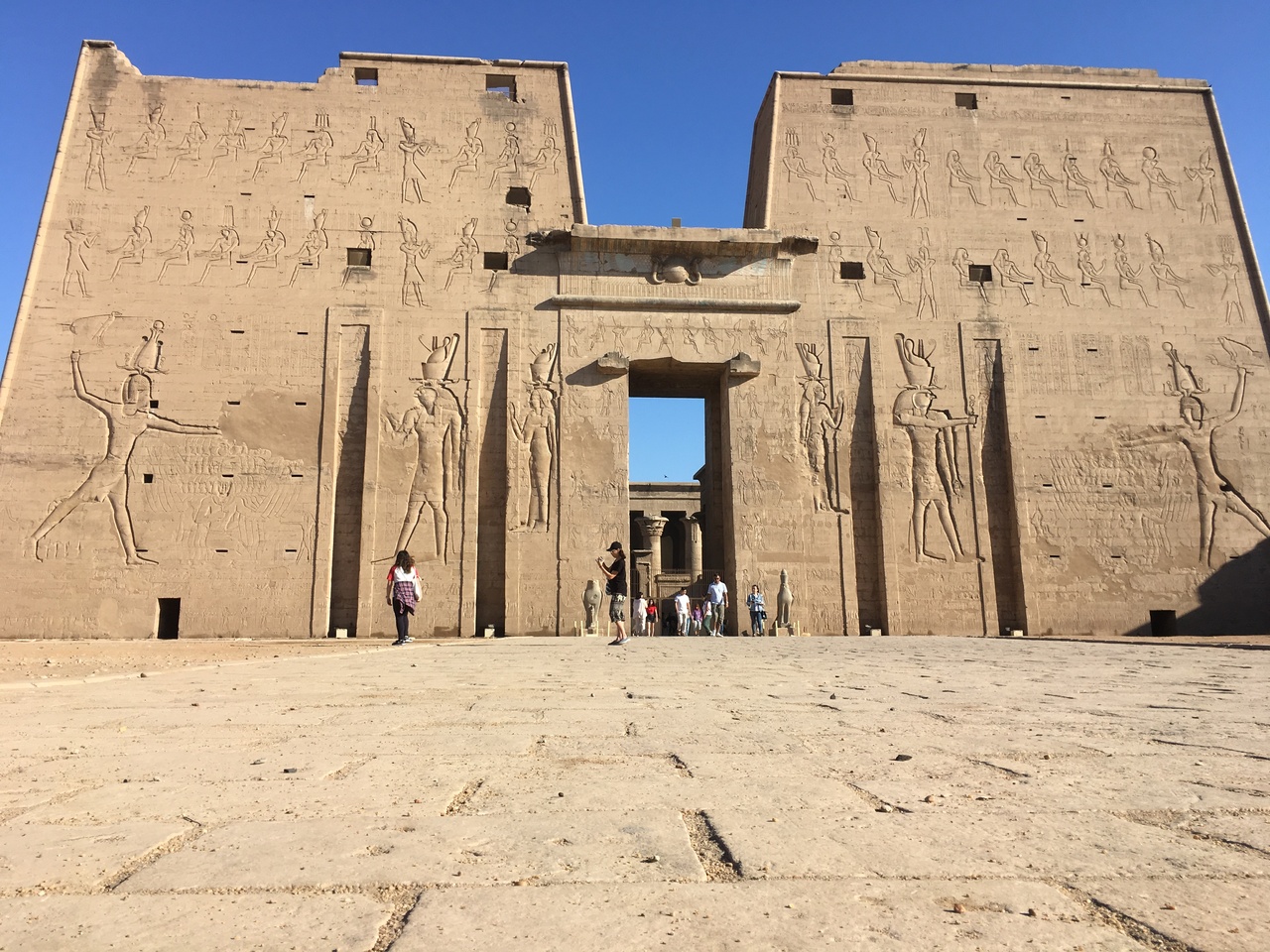 エドフという小さな町にある巨大神殿です。紀元前237年から約180年間かけて完成したもので、完成したのはクレオパトラの父であるプトレマイオス12世の時でした。エジプトの神々の中で最も古く、最も偉大な神と言われる天空と太陽の神「ホルス」を祀った神殿です。迫力ある巨大門が印象的で、高さ36m、幅137mと、度肝を抜くスケールです。