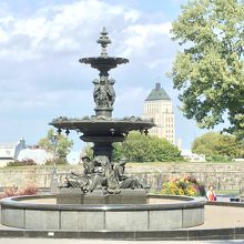 ケベック州議事堂前にある「トゥルニーの噴水」は、ケベック・シティ誕生400年を祝って地元の老舗から市へプレゼントされたものです。この噴水は元々、フランスのあボルドー市にあったものが、不要になり、パリの蚤の市で売られていたものでした。それをケベックの老舗経営者が買い取って、ケベックに贈ったということです。こんな大きなシロモノを蚤の市で売っていたことにも、それを買う人がいることにも驚きです。夜になるとライトアップされて、とても綺麗でした。