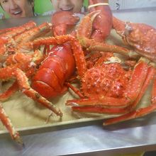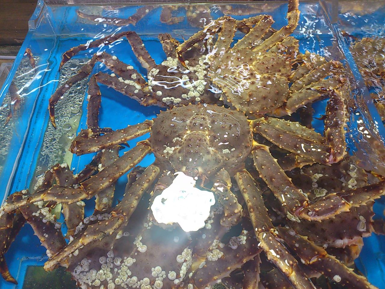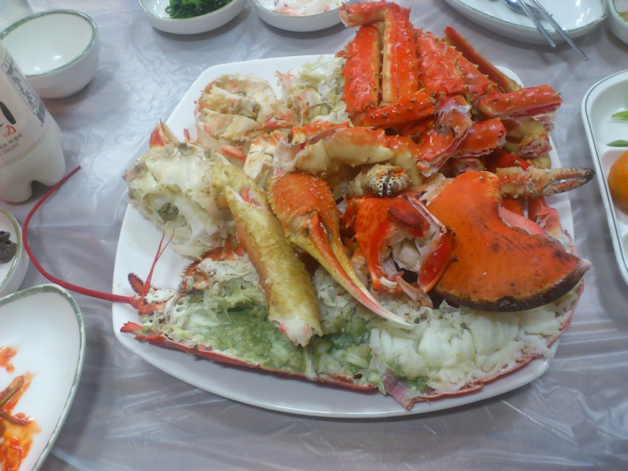 機張市場を歩くとカニの生け簀が沢山あり、タラバガニ、ズワイガニ、ロブスターがずらっと並びます。