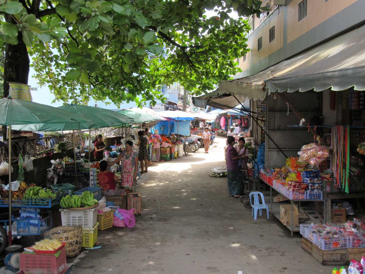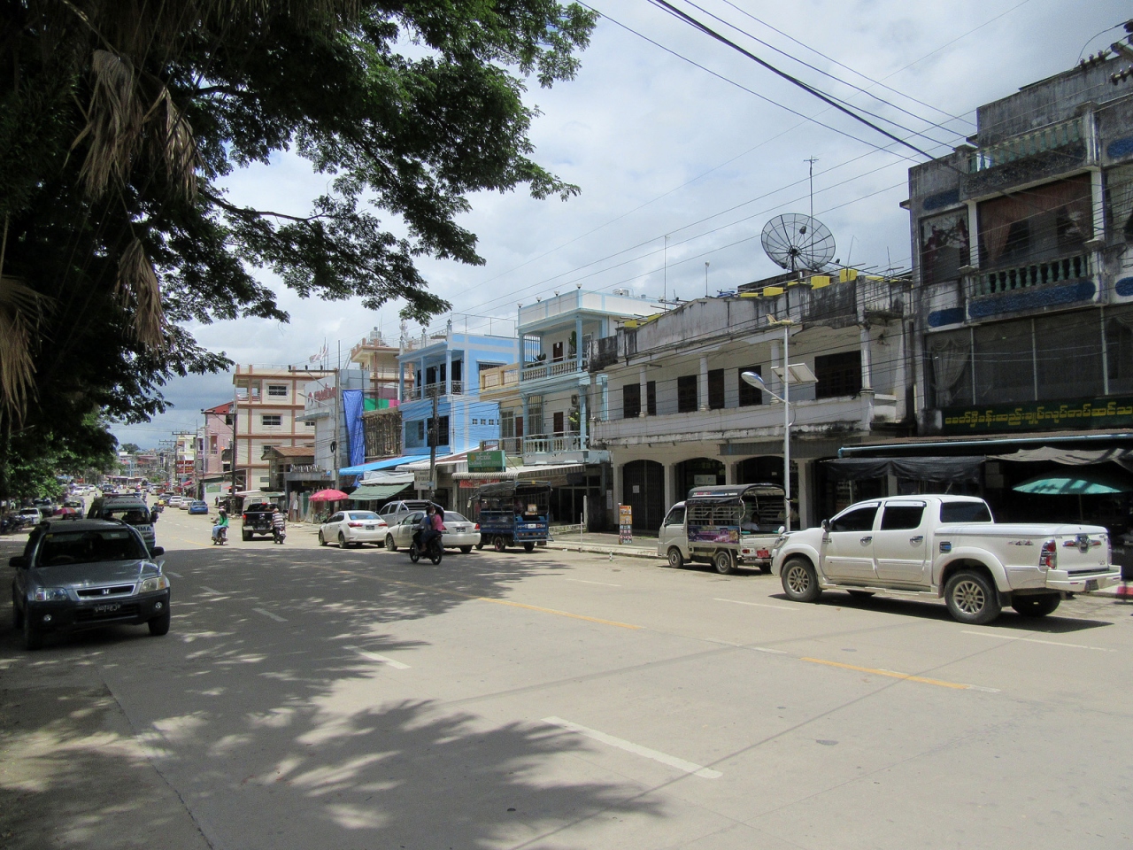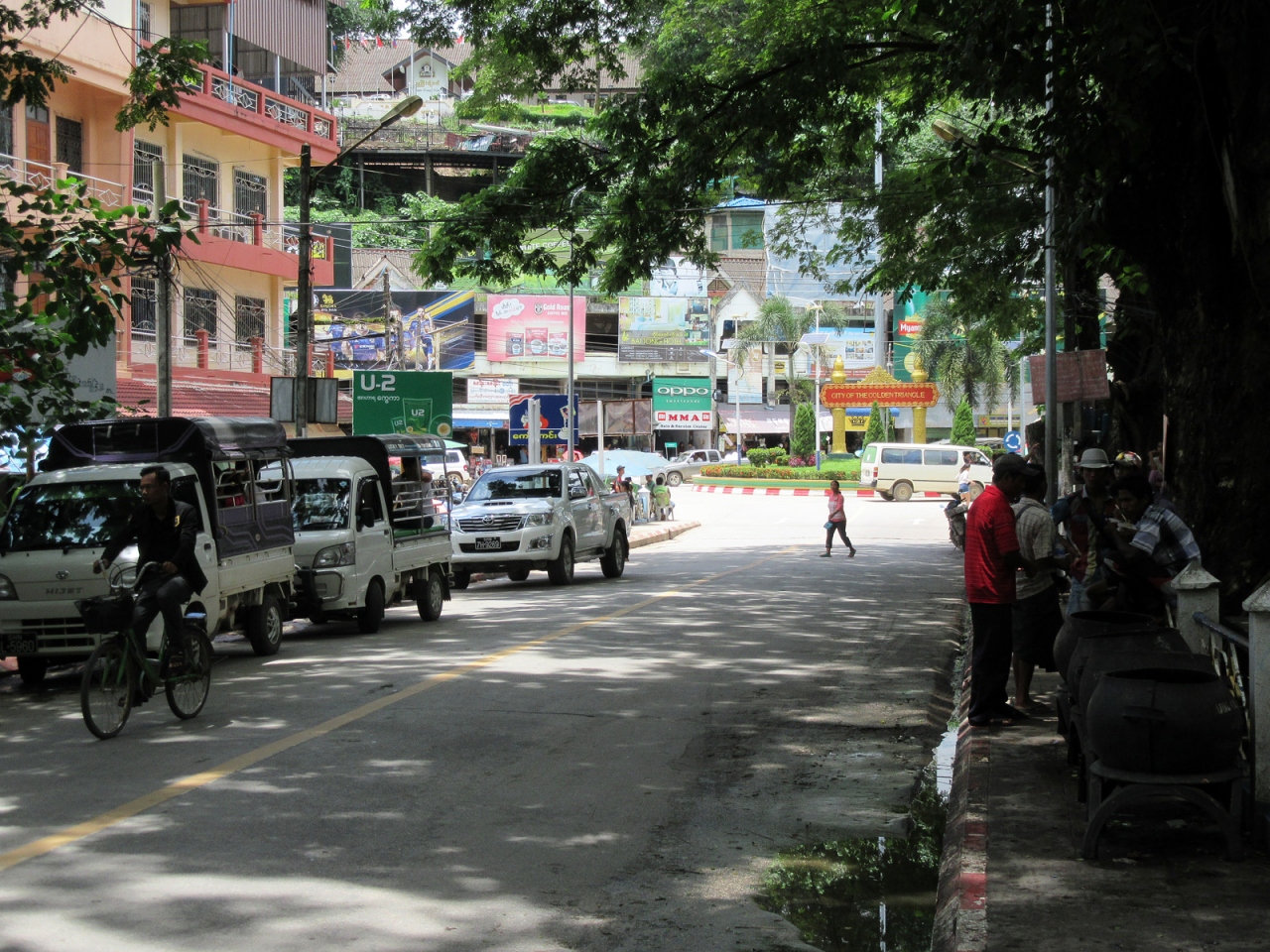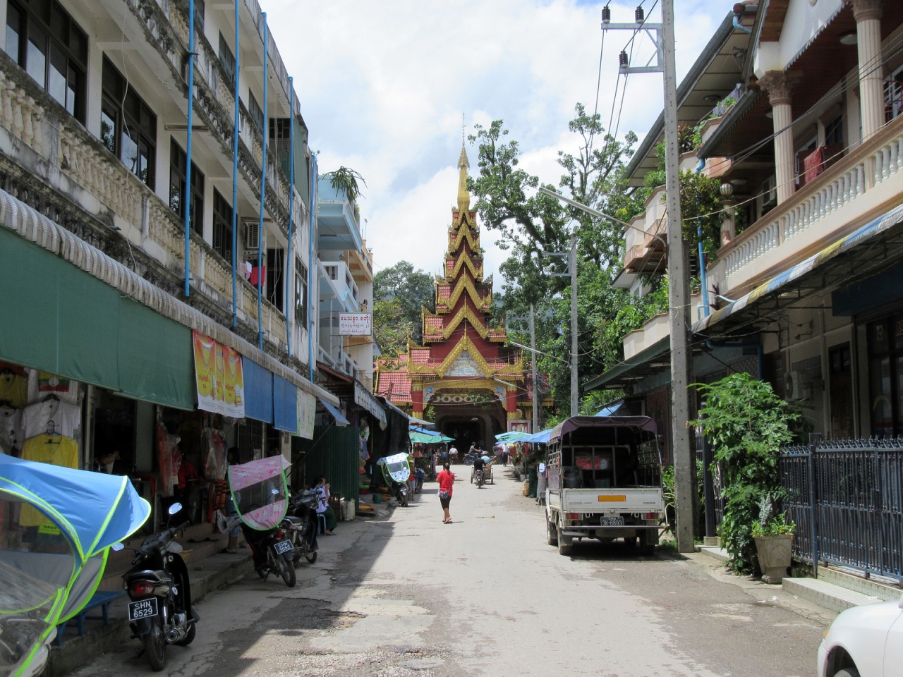 ミャンマー側で入国手続きを終えてそのまま直進、すぐ右手の階段を下れば市場ですが、さらに直進するとロータリーがあって、多くのトゥクトゥクが客待ちしています。私はロータリーを右手に折れて街歩きしました。その街並みは、日本でいえば昭和20年後半から30年代前半…といったところでしょうか。建物の雰囲気だけでなく、その空気の埃っぽさ、小川に捨てられているゴミの多さ、道端の屋台に積まれた果物、床に敷かれたビニールに商品が並べられている商店があったりするのも、そんな時代のような気がします。そんな中にも立派な寺院があるのは、さすがミャンマーです。