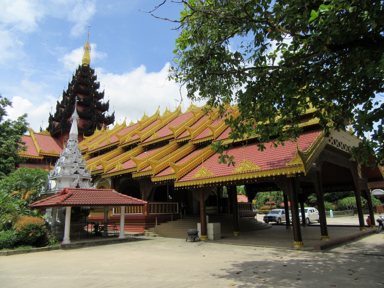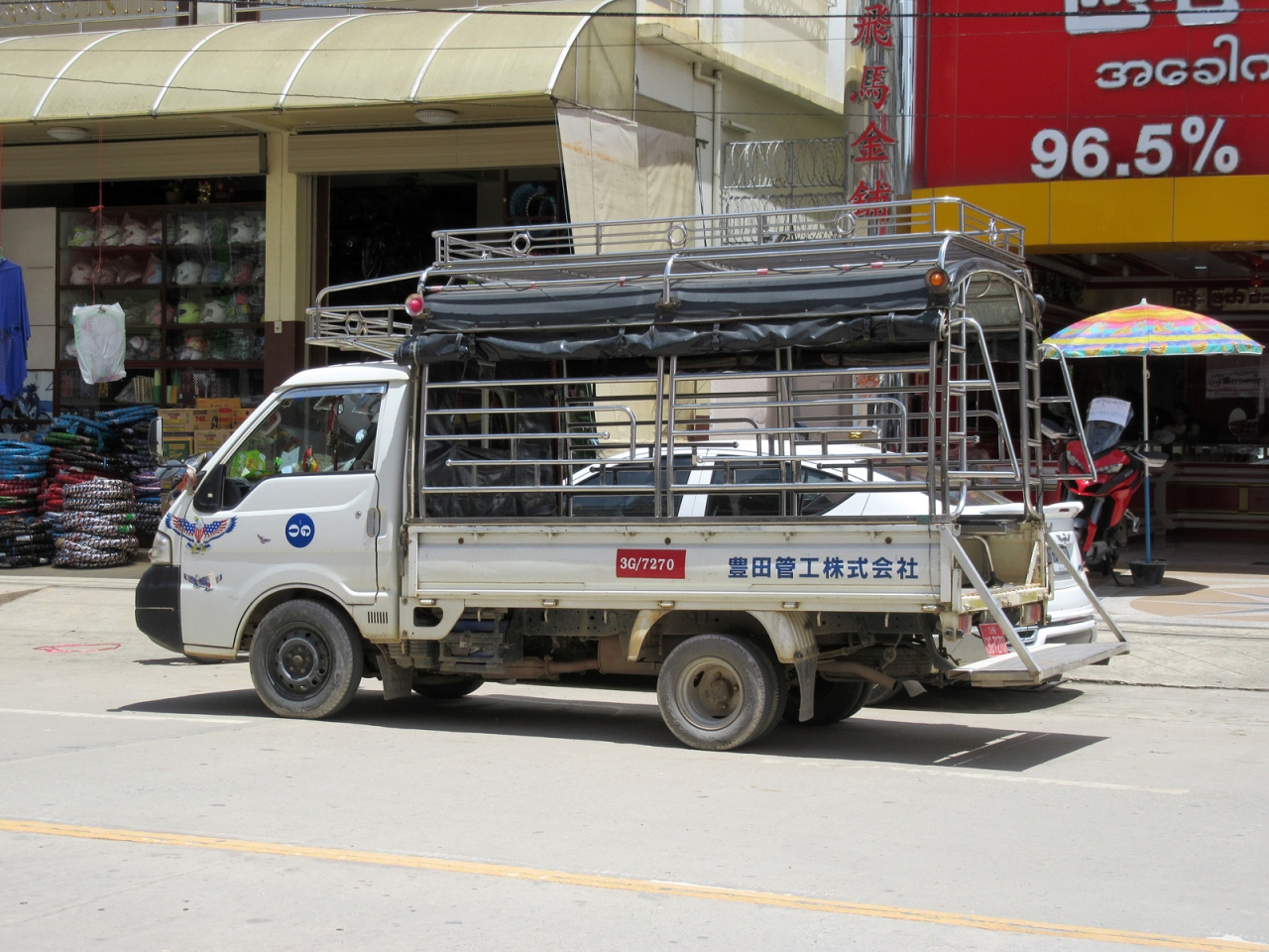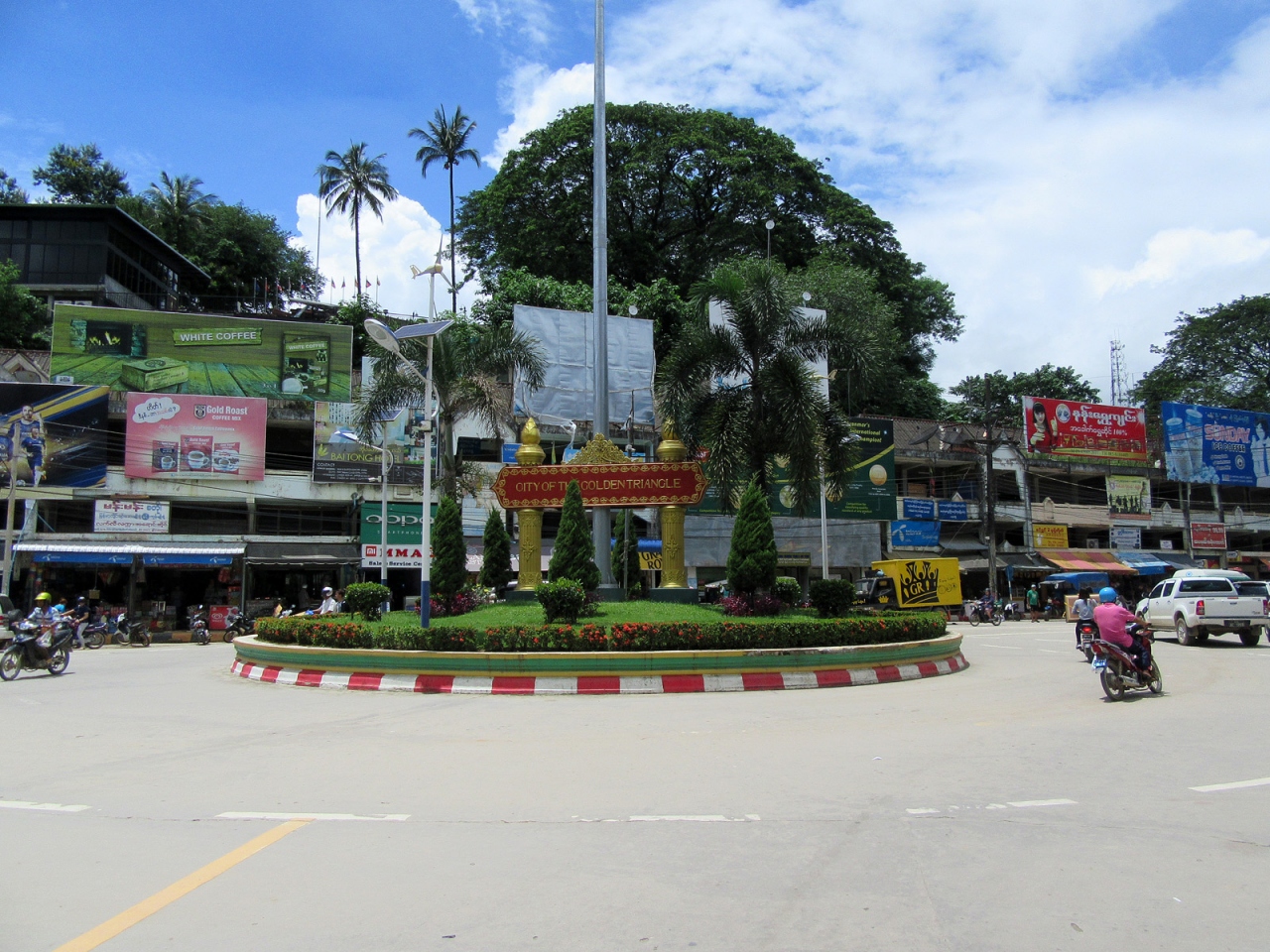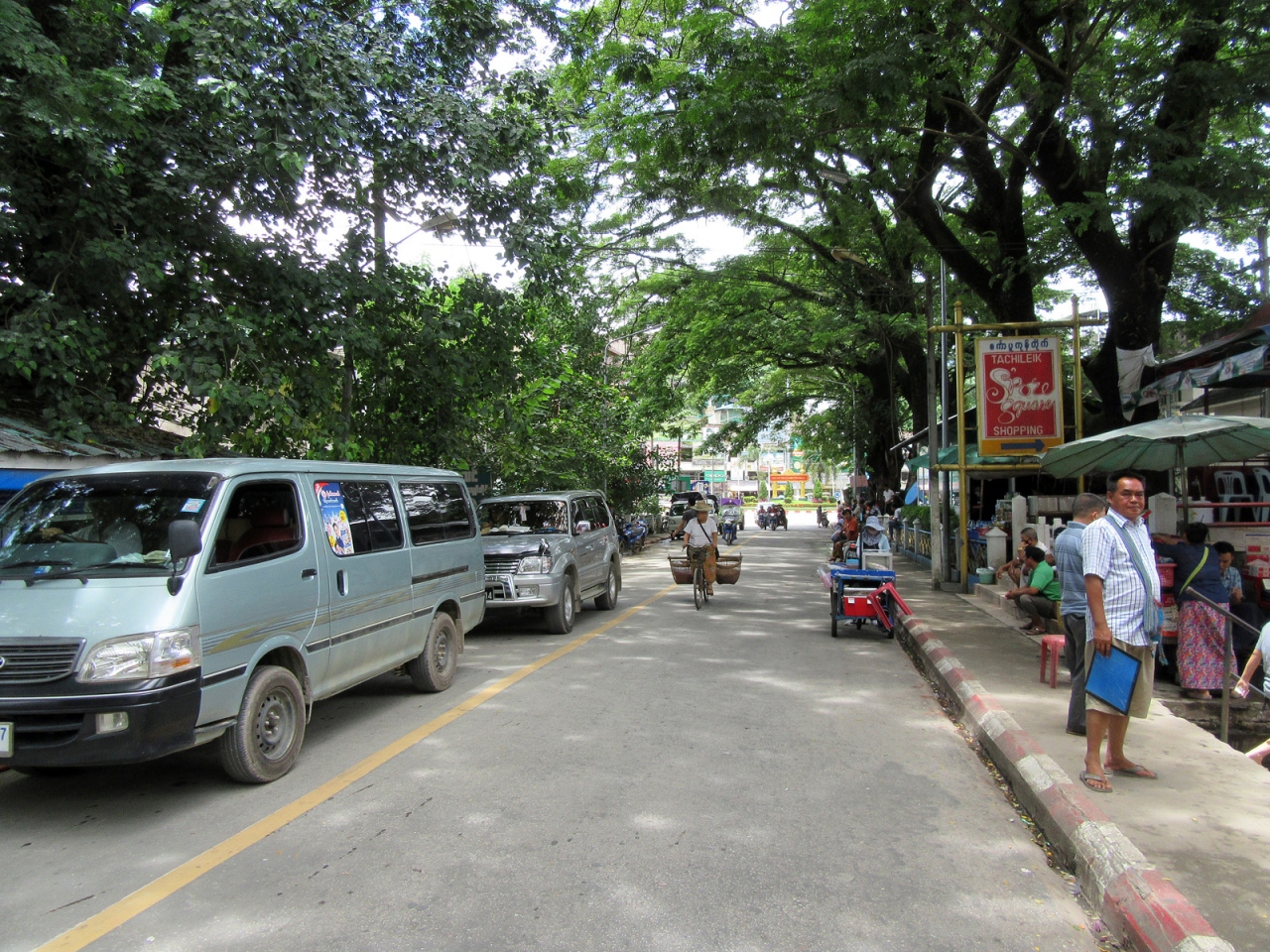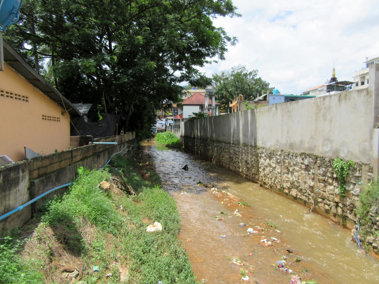 ミャンマー側で入国手続きを終えてそのまま直進、すぐ右手の階段を下れば市場ですが、さらに直進するとロータリーがあって、多くのトゥクトゥクが客待ちしています。私はロータリーを右手に折れて街歩きしました。その街並みは、日本でいえば昭和20年後半から30年代前半…といったところでしょうか。建物の雰囲気だけでなく、その空気の埃っぽさ、小川に捨てられているゴミの多さ、道端の屋台に積まれた果物、床に敷かれたビニールに商品が並べられている商店があったりするのも、そんな時代のような気がします。そんな中にも立派な寺院があるのは、さすがミャンマーです。