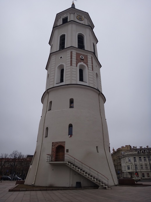 ヴィリニュス旧市街のカテドゥロス広場に大聖堂と並んでいます。近くにStebuklas(奇蹟)と書いた敷石があって、その上で3回転すると願いが叶うそうなので、早朝に探しに行きました。朝のカテドゥロス広場は静かで人が少なく、そこに並んだ白い鐘楼と大聖堂はとても印象的でした。