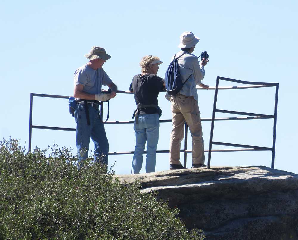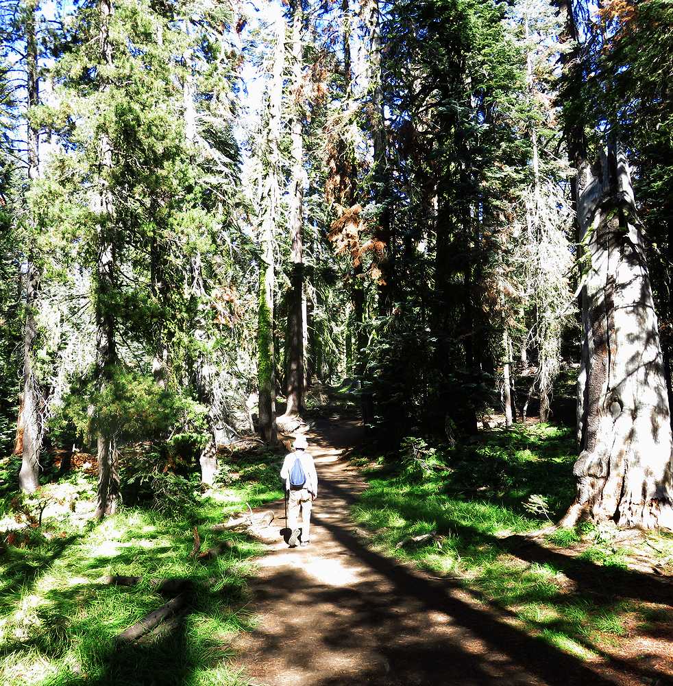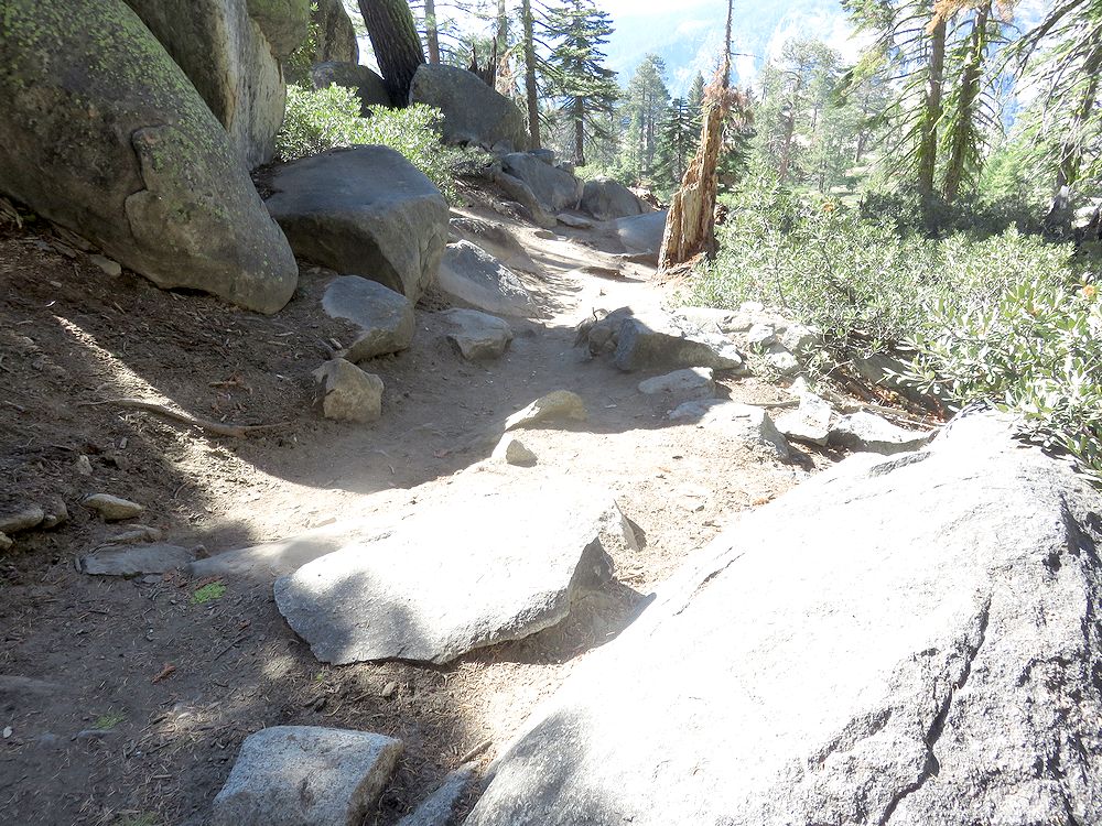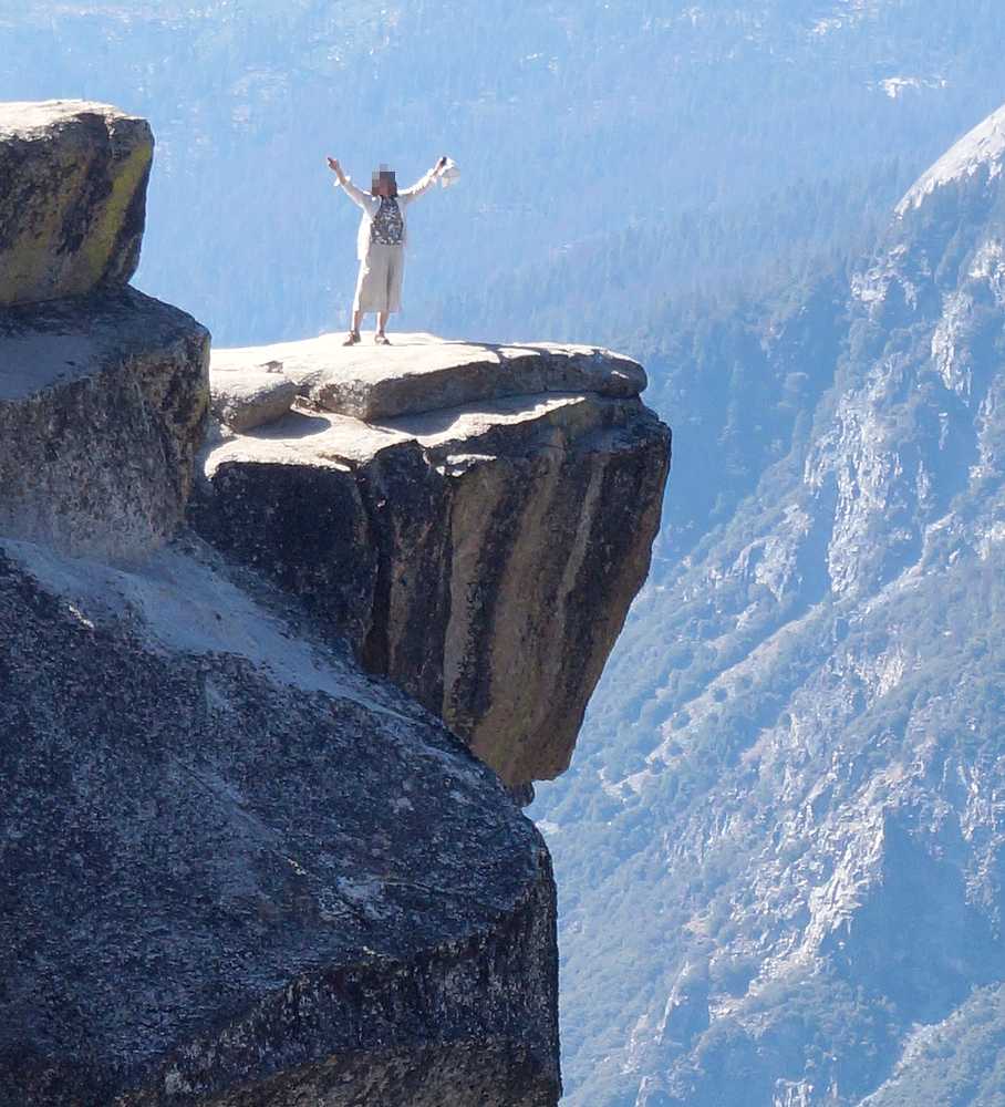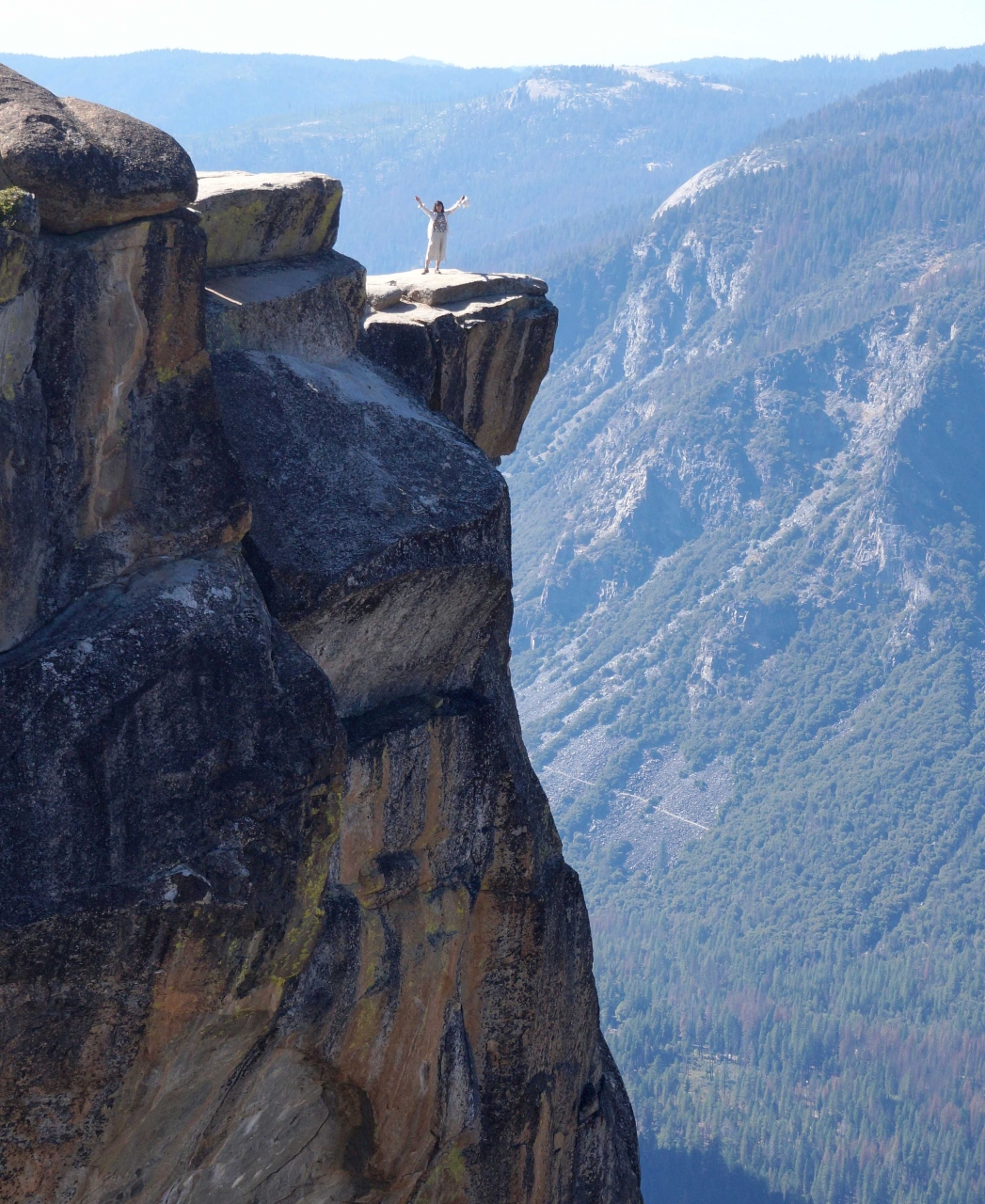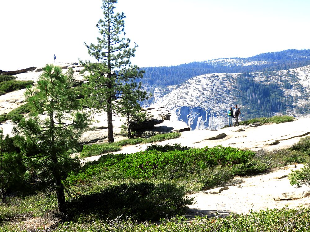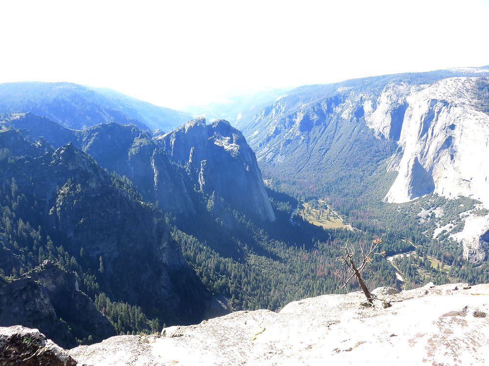 グレーシャーポイントから少し車で下ると、駐車場があり、そこからセンチネルドームとタフトポイントへの二つのトレイルが伸びています。私たちが行った時は駐車場があいにく満杯で、Uターンしてから駐車場を過ぎたところにようやくスペースを見つけて、何とか路肩に駐車できました(夏は駐車はむずかしいかも)。センチネルドームまでのトレイルを歩いた後、駐車場下まで戻り、余力があったので、反対側に伸びるタフトポイントまでのトレイルを歩いてみることにしました。こちらは、大きな石が点在し、苔むした大木の中を緩やかに下る道が続いていて、初心者でも歩ける道でした。林の中を抜け、急坂を下ると、視界が開け、広々とした平坦な道を歩き、恐る恐る崖淵へ進むと、かなり下の方にヨセミテバレーが見えました。ノルウェイのプレーケストーレンに匹敵するくらいの崖でした。タフトポイントの先にはさらに恐ろしい崖が見えたので、私だけ行って、主人に撮影してもらいました。そこはHanging Rock と呼ばれ、7200ft(2196m)のところにあるそうです。ノルウェイのトロルの舌ほどではありませんが、スリル満点の岩でした。往復1時間弱(2マイル)、センチネルドームもあわせると3時間のトレッキングですので、時間のある人は両方トライしてみてはいかがでしょうか。個人的にはどちらか一つを選ぶとすれが、センチネルドームからの眺めはグレーシャーポイントとそれほど違わないので、タフトポイントを選びます。