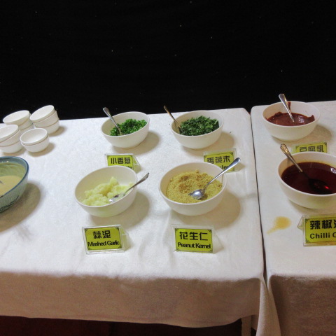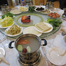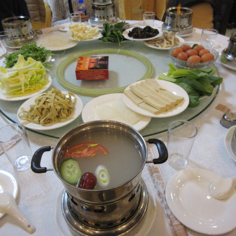 ツアーで行った西安の夕食場所。1階は劇場で2階がレストラン。外国人客の多い場所です。観劇はせずに夕食会場へ。一人鍋、ですが、薬味を別の場所に取りに行くのが面倒。一人鍋の火力は日本の旅館でよく見かけるロウ、とは違った感じで、鍋にフタをするとすぐに煮えます。赤いクコの実とナツメが入った薬膳火鍋の料理でした。客が多いので、混雑して、入れ替え制のようです。建物の前にはバスが連なり、繁盛していました。