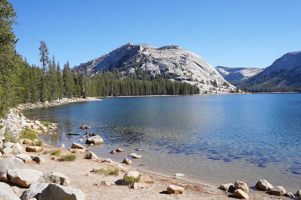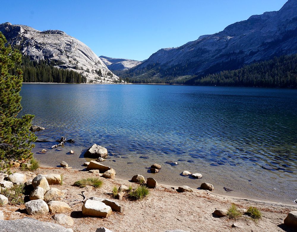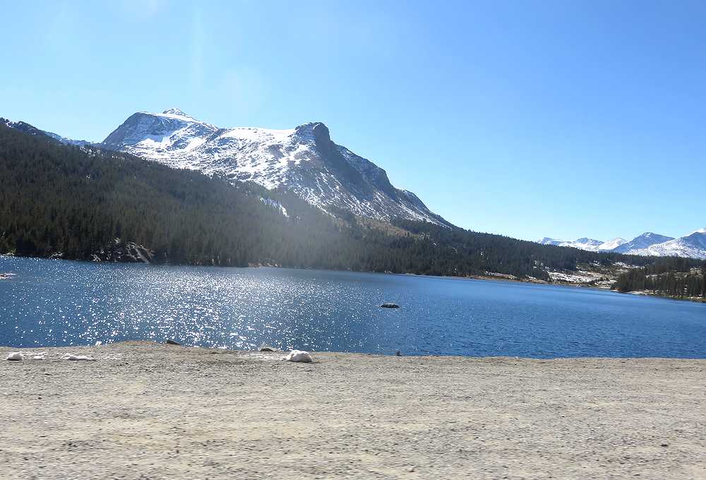 ヨセミテ国立公園のTioga Road沿いにある湖です(標高2484m)。Olmsted Pointから2.5キロ離れたところにあり、花崗岩のドームやロッジポールの森などで囲まれています。ここは、レンタカーでヨセミテバレーからMono 湖に向かう途中通りました。天気もよかったので、湖の色が青く、湖底が見えるほど水が澄んでいました。ヨセミテバレーからのロングドライブの後で、休憩するのにいい場所だと思います。私たちもここで少し休憩し、Tioga passにある公園東ゲートを通ってMono湖へと向かいました。ゲートを過ぎて峠を下っていくと、その途中にTioga湖とEllery湖が続いて現れます。こちらもTenaya湖に劣らず美しい湖なので、是非立ち寄って見ることをお勧めします。