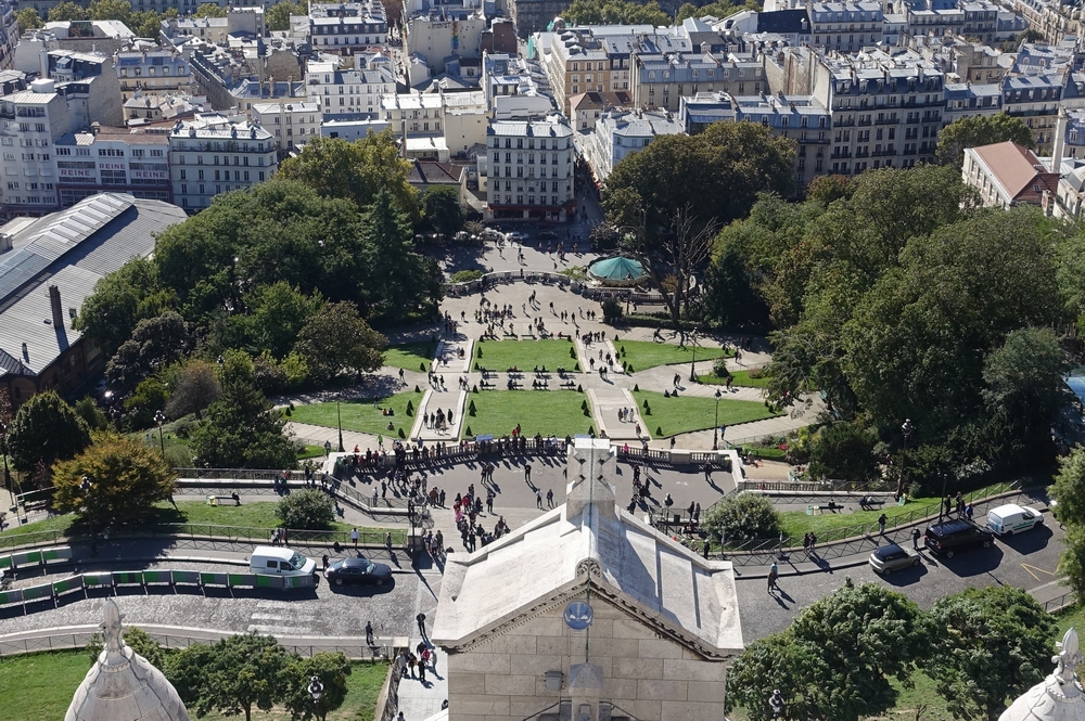 サクレクール寺院前の南側斜面に広がり、丘の上の寺院を見上げる形になります。ベンチや芝生でのんびりしている人がいる一方で、怪しい人もちらほらいるので気を付けましょう。一人だったので注意してましたが、幸運にも(?)声をかけられることがありませんでした。サクレクールまでの階段がきついという人は、西側に並行してケーブルカーが通っているのでそちらへ。