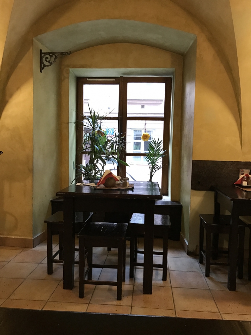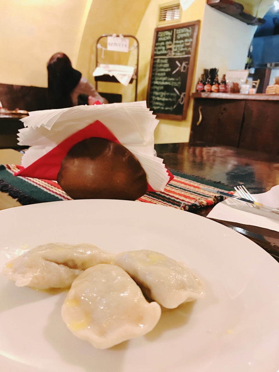 英語メニューもあり。ハーフポーションがあったのでレンズ豆入りのピエロギにしました。