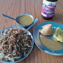 せっかく大学に来たのですから構内をうろうろ…。大学とは思えない規模でローカルな公園のようです。そしてお目当ての学食を発見!場所は入口の門から見ると左の奥の方です。メニューは見当たらなかったのでスタッフの方に聞きながらオーダー。チョウメンハーフ、サモサ、じゃがいもの揚げ物、ダルのようなスープでお値段70Rsでした。しかし、その後にやって来た学生がダルバートを食べていました。うう…こっちのがよかった…値段を聞くと120Rsでした。学食目当ての博物館もありだと思います。