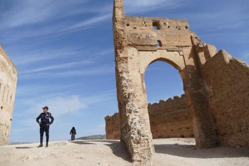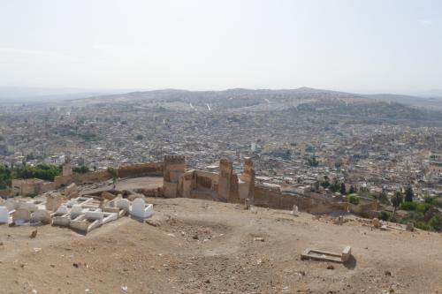 フェズ市街を見渡せる小高い丘の上の遺跡です。城跡のようなものや門のようなものが残っていますが、僅かです。ガイドマップにはTOMBEAUX MERINDES(マリーン朝の墓地)となっているように、墓地を見下ろすことが出来ます。