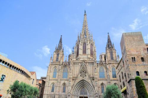 サンタ・エウラリア教会。現在の姿になったのは14世紀の事だ。ゴシック様式の建物で空に突き刺すかのように尖った印象が強い美しい教会。教会の前の広場には青空市場よようなものが開かれ、お土産店が軒を連ねている。バルセロナ観光のお土産物もここで選んでみてはどうだろうか。