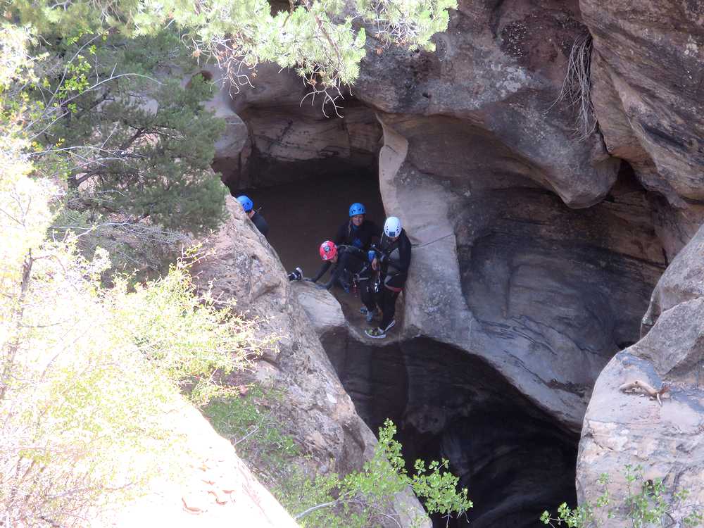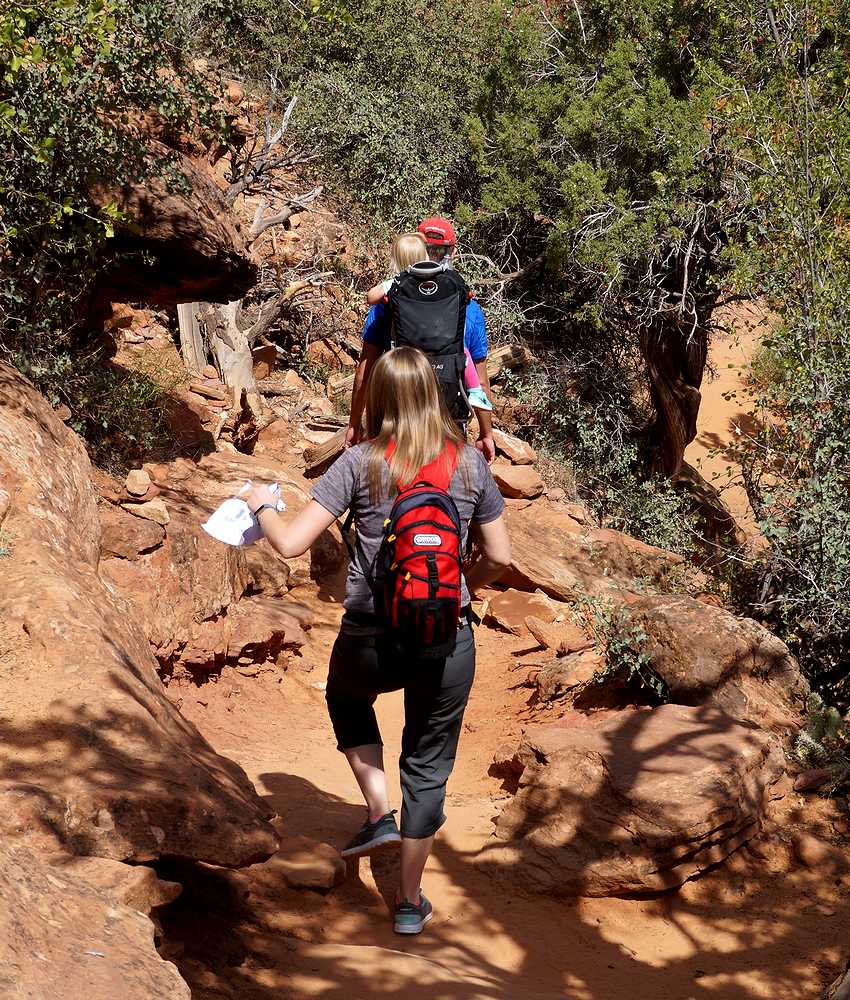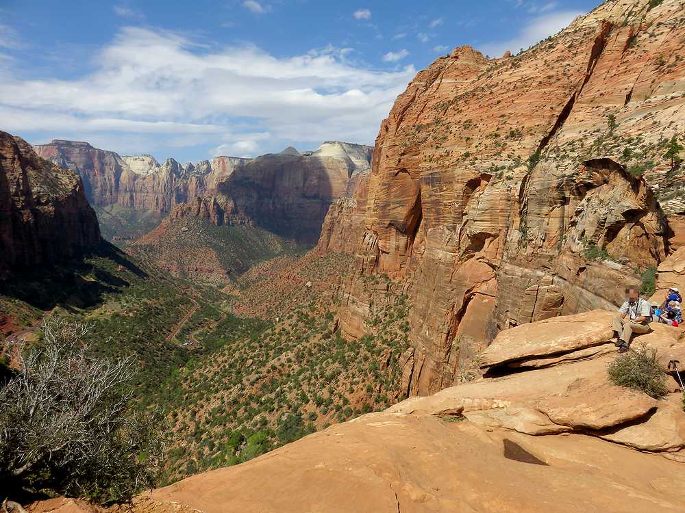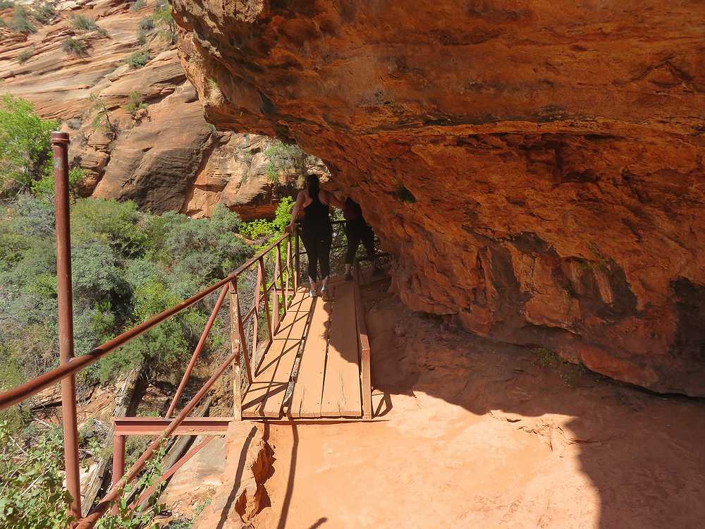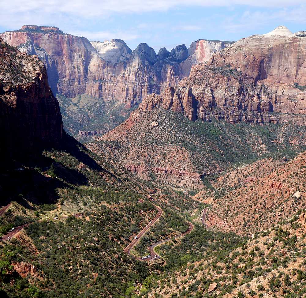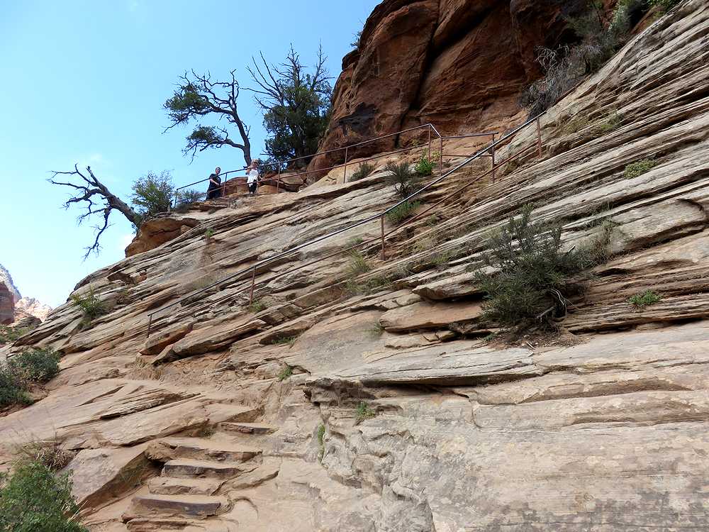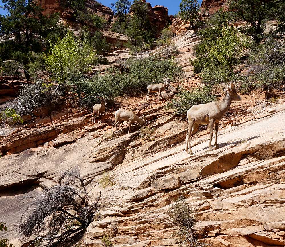 ザイオンで一番の景勝地だというので、シャトルバスに乗るのは後回しにして、そのままザイオンマウントカーメル・ハイウェイに向かいました。トンネル(1.1マイル)を出てすぐのところに駐車場があると聞いていたのですが、トンネル内が交互通行のため、前に待っている車がないにもかかわらず、10分ほど待たされました。夏の混む合うときはここでかなり待たされることを覚悟しなければならないと思います。駐車場は想像した以上に狭く、まったく空きがなく、しかも空き待ちのスペースもありません。辛うじて切り替えし駐車場を脱出できましたが、しばらく先へ走ってはみたものの、駐車できるようなスペースは見つけることができず、Uターンしてザイオン方面に戻る道沿いの空地に駐車できました。ただしザイオン方面に向かう道もトンネル手前で長蛇の列ができている場合は駐車も難しいかも知れません。幸い時間が早かったせいか(11時半ごろ)、その時は車列がそれほど長くはありませんでした。駐車したところからは5分ほど歩いたところで、トンネル手前右側にトレイルヘッドがありました。トレイルのアプローチで急な階段を登り、途中深い渓谷を見下ろす崖ぞいの道(ときには板張りの)が続き、あとは比較的緩やかな上りの道を歩くと展望台に到着します。片道30分の短いハイキングコースでした。展望台からは正面にタワーズ・オブ・ザ・バージンの峰々が見え、右側にはグレートアーチ、下の方には走ってきた九十九折のザイオンマウントカーメル・ハイウェイが見渡せます。私はハイウェイ途中の眺めがあまりにも凄すぎて圧倒されていたので、ここからのながめは山が遠い分、迫力に欠ける気がしました。9月末とはいえ、晴れている昼間は日ざしが強く、帽子と水は必須です。トレイルの出口付近では4頭のビックホーンシ―プに出会いました。どうやらこの辺に住んでいるらしく、出会う機会は多そうです。