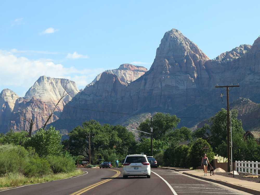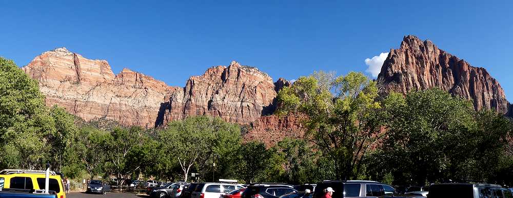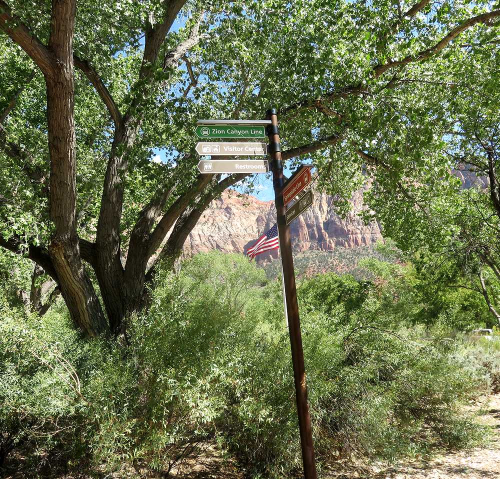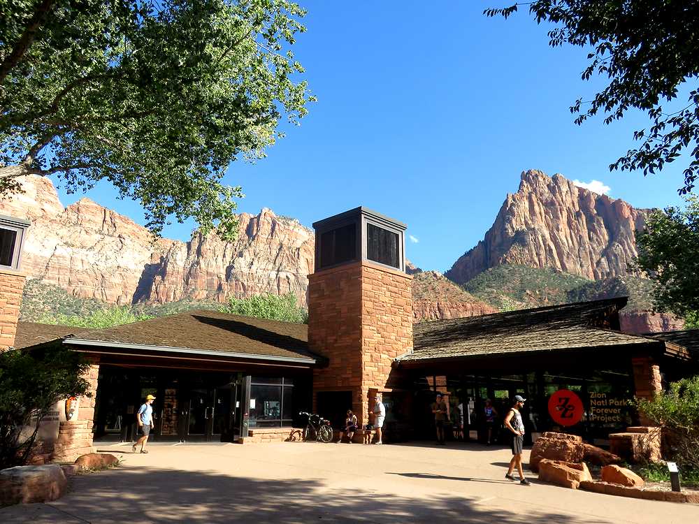 ザイオン国立公園内はシャトルバスで移動しなければならないので、駐車が問題だということを聞いていたので、ラスベガスに宿泊した翌朝早くに出発して、4時間後(時差があるの実際は3時間)の10時過ぎにザイオンに到着。先にキャニオンオーバールックへのハイキングを済ませてから、昼過ぎにヴィジターセンター前の駐車場に行きました。すんなりと駐車できました。シャトルバスに乗る前にトイレのマークのある方向に歩いて行き(この時点で公園ゲートを出たことに気付かなかった)、トイレをすませたところ、シャトルバスが止まっていたので、行き先も確かめもせず、乗りこんでしまいました。ところがこのバスが公園とは逆のスプリングデール行きのバスで、結局スプリングデールの町を一周りしてからまた公園にもどることになり、30分もロスをしてしまいました。戻った後で、公園終点を往復しているバスの乗り場は別の場所にあることがわかり、そこまで移動。その途中にゲートがあり、年間パスの提示を求められましたが、パスは車の中に置いてきたと言うと、これから気をつけるようにと、通していただきました。パスは常に携行したほうがいいでしょう。目指すバス停は駐車場すぐ横のヴィジターセンターの前にありました。シャトルのバス停は2カ所あり、バスもスプリングディール行きと、公園の奥行きとの2系統に分かれているので、私たちのような間違いはしないように注意してください。