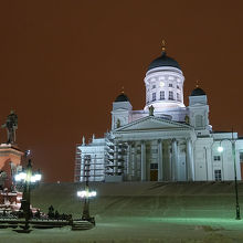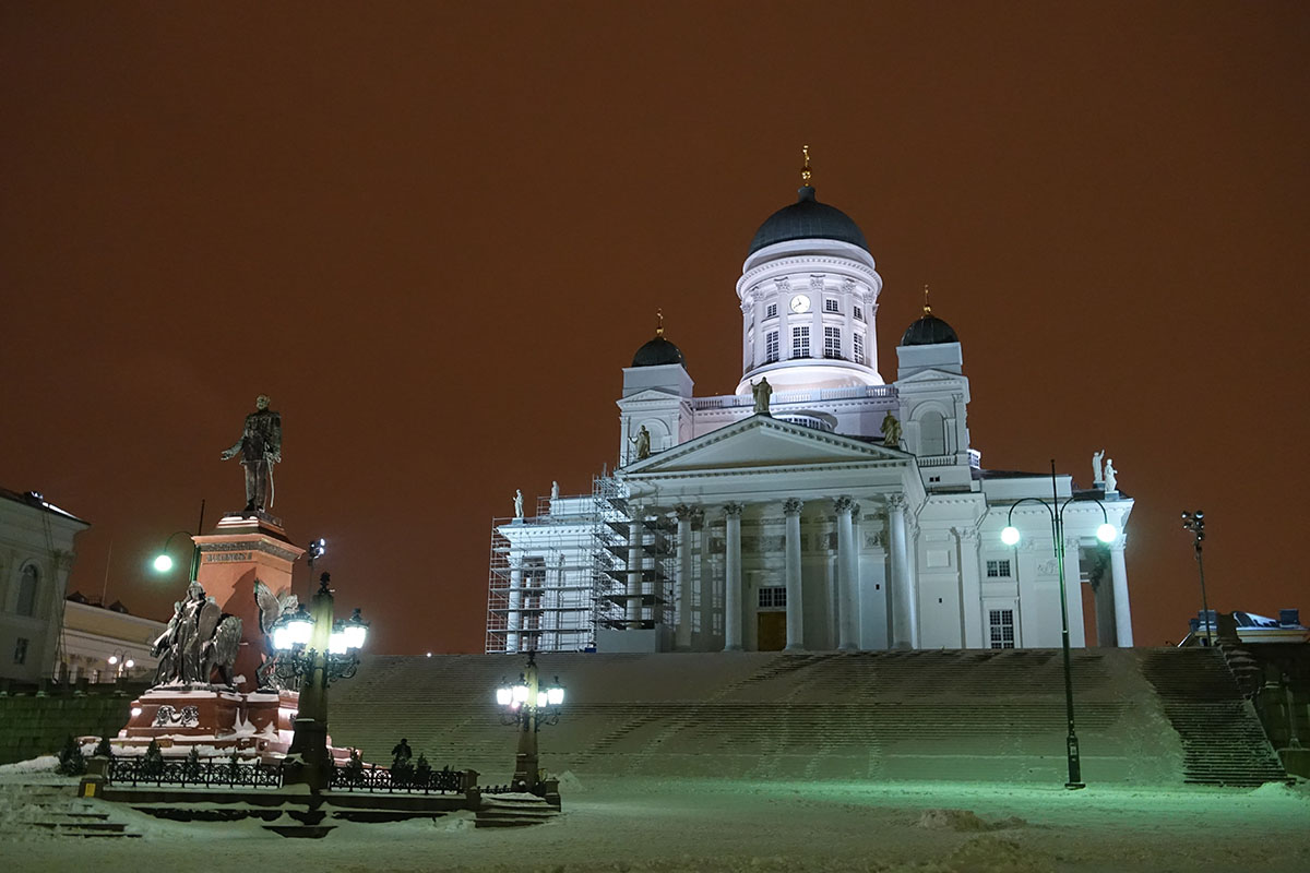 ヘルシンキ大聖堂の前の広場です。ロシア皇帝アレクサンダー2世の銅像があり、夏場はいつも観光客で賑わっています。冬はさすがに寂しくなりますね。前の通りの向かいにアテネウム美術館があります。ヘルシンキ大聖堂への階段や広場のベンチからトラムや人の往来をのんびり眺めるのも悪くないです。
