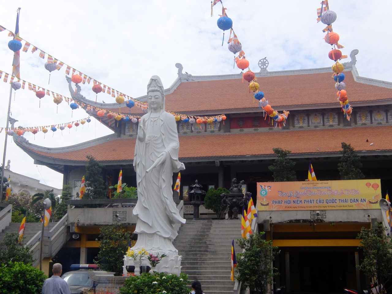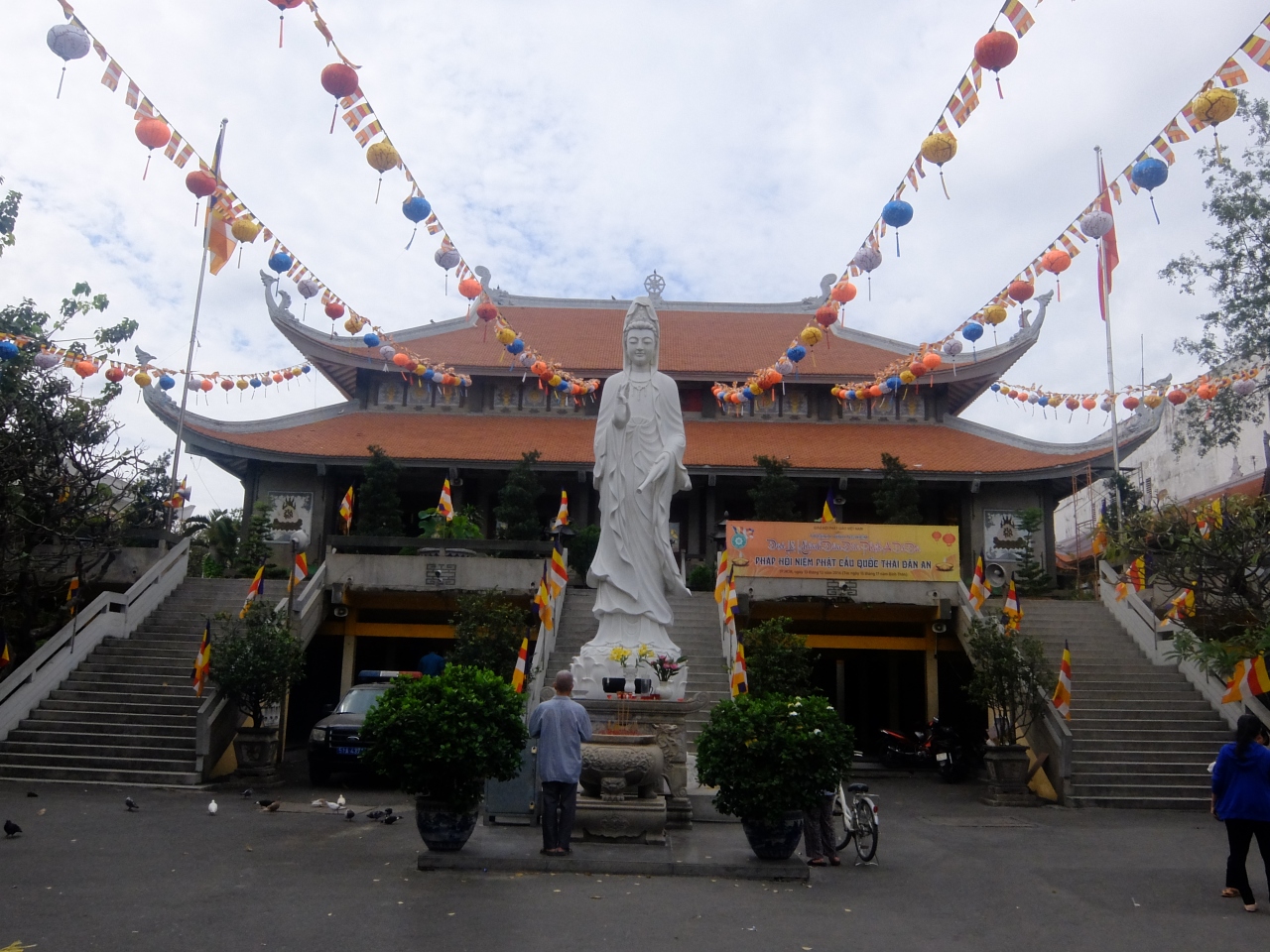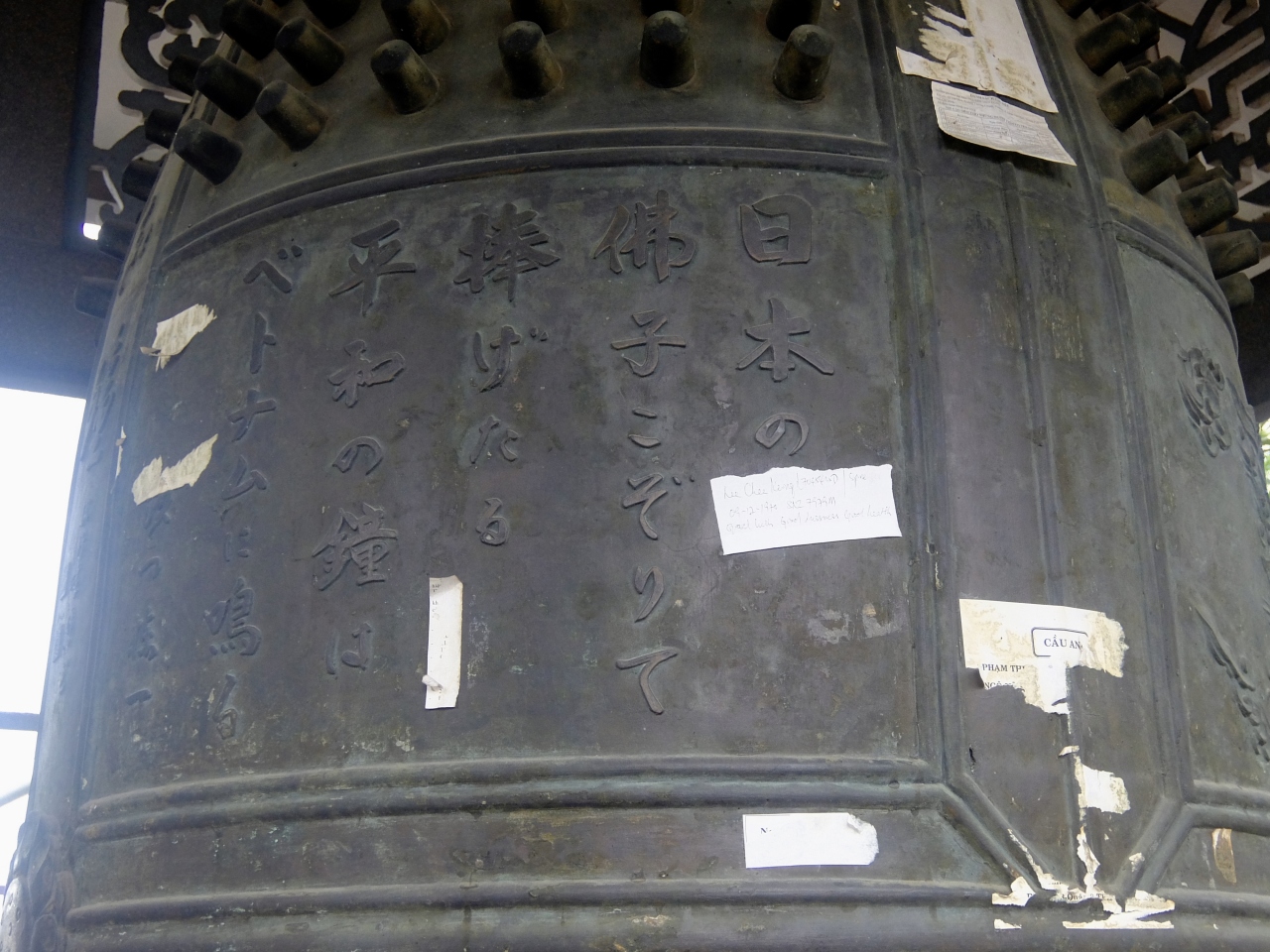 日本と縁が有る大きなお寺です。鐘楼の鐘は日本のお寺から寄贈された物で日本語が刻まれています。本堂の外に大きな観音様、高い七重の塔、舎利塔が有ります。越南ではよく見かける光景ですが綺麗な娘さんの撮影が行われています。モデルさんなのでしょうか。