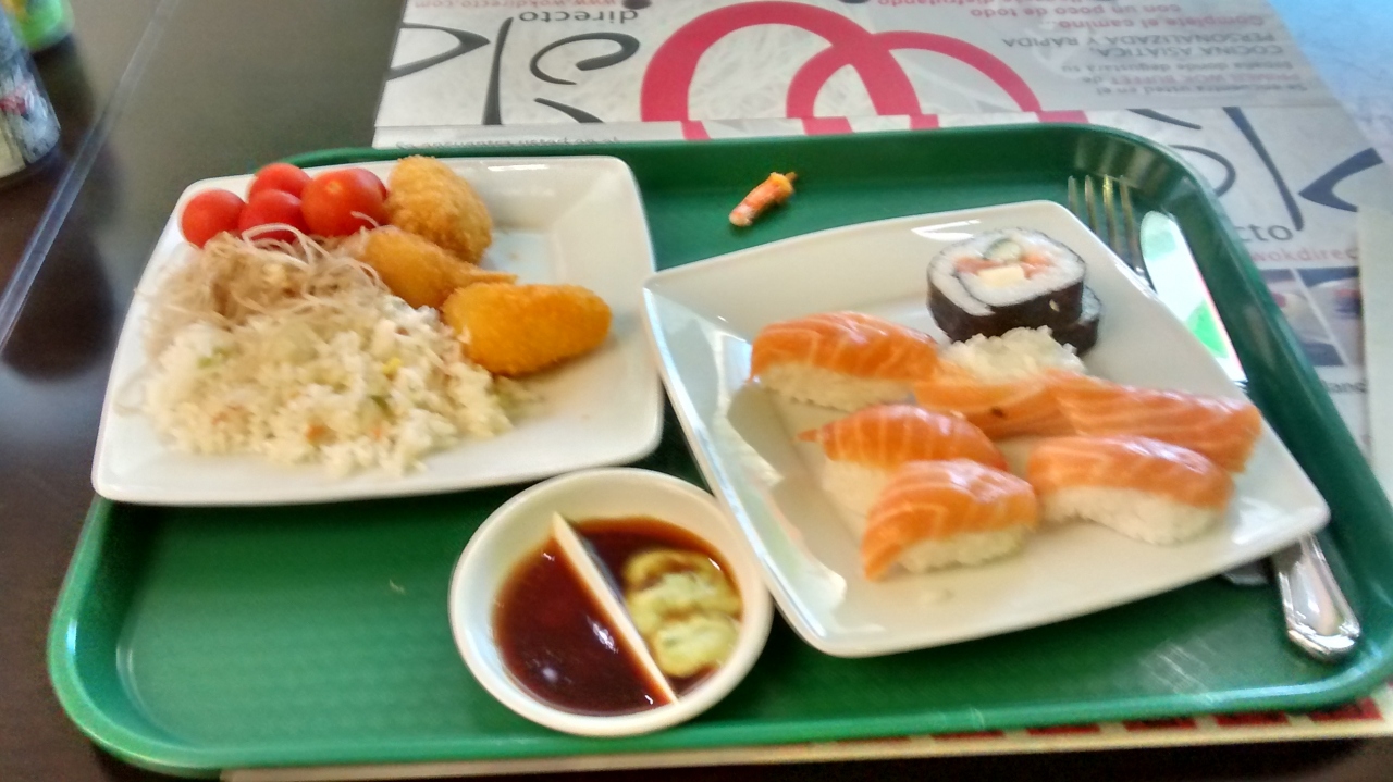 ガラス張りのモダンな建築のマラガ駅で、高速列車に乗る前に、手短にランチを食べました。食べ放題で、シーフード・寿司もどき・デザートをはじめ色々あって、質も良く安くて、大変美味しかったです。白身魚のすり身をカニの爪に似せたムスリートという揚げ物が特に良かったです。