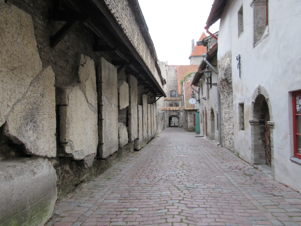 通りの途中の壁に大きな石板がかかっていますが、これは14~15世紀頃の墓石だそうです。