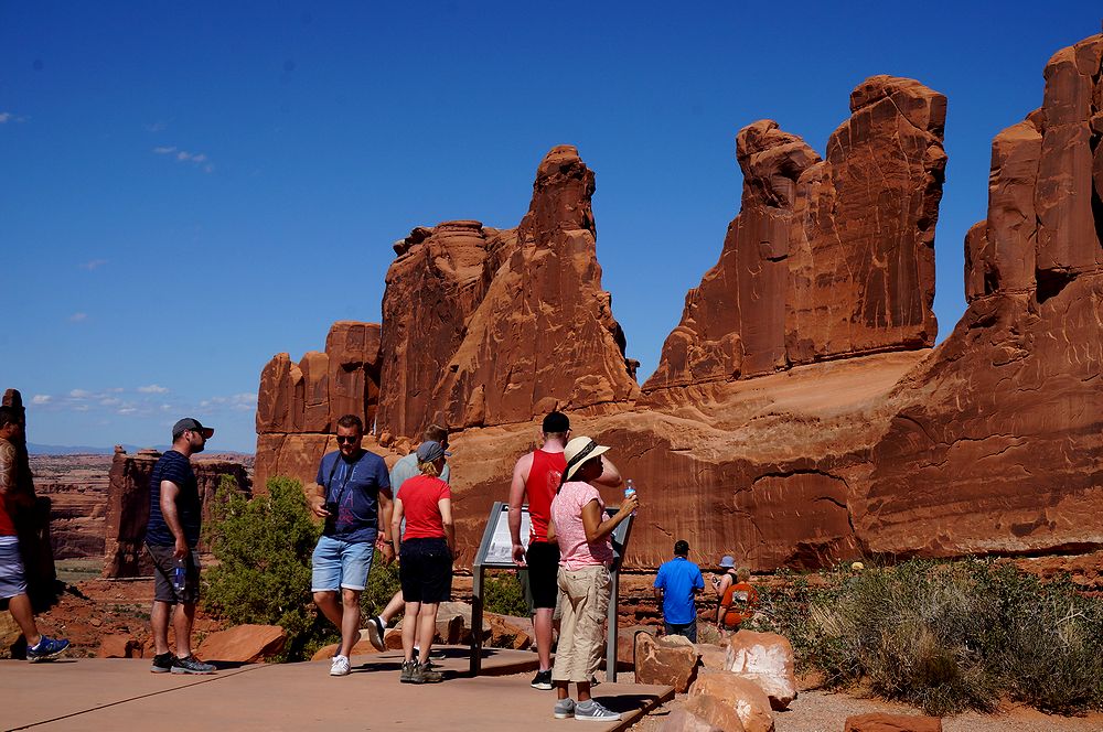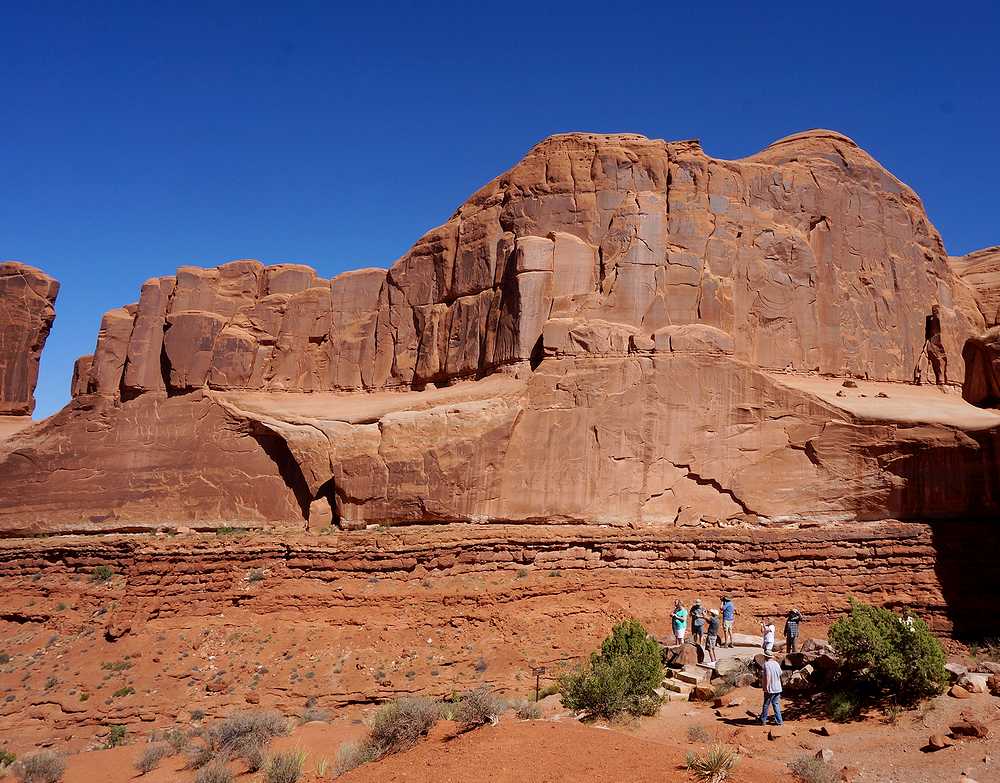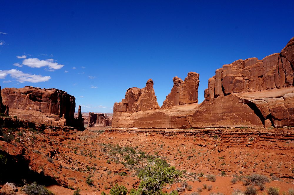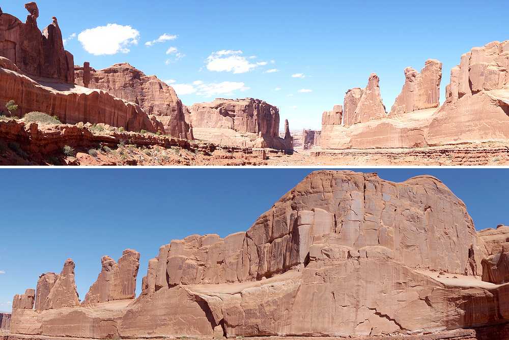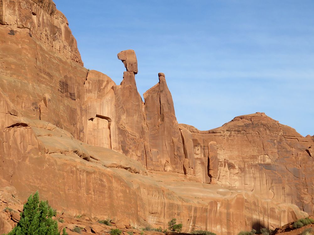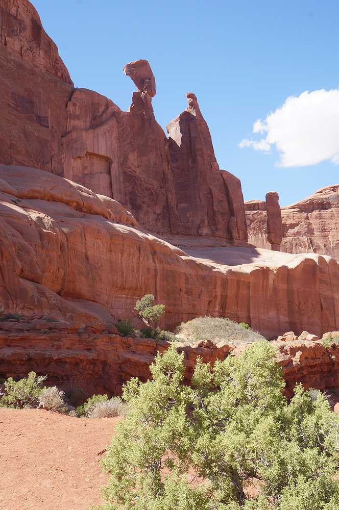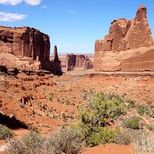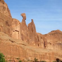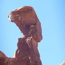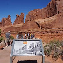 公園ゲートから2.4マイル走ると左側に駐車場があります。そこから少し歩いて中に入ると説明板のある展望テラスが設けられています。ここは両側の岩壁がニューヨークのマンハッタンのビル群に似ていることから、この名が付けられたようです。正面の眺めはまるで一枚の奥行きのある絵画を見ているかのようで、絶景です。左側の岩壁のてっぺんにはエジプトの王妃(Queen Nefertiti)の横顔に似た岩もあります。なお、ここはインディ・ジョーンズの映画「最後の聖戦」のロケ地につかわれたそうです。公園ゲートに近く公園見学の行き帰りに必ず通るところなので、ダブルアーチやデリケートアーチのようなアーチだけではなく、見逃してはならない場所の一つだと思います。せひ立ち寄って見てください。