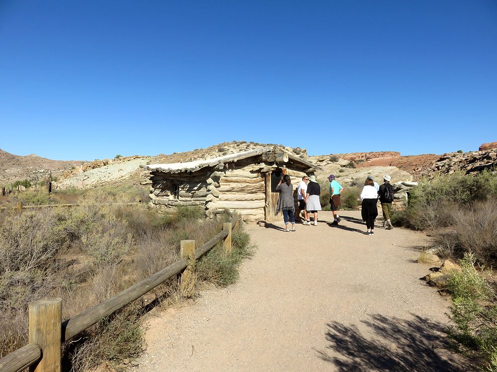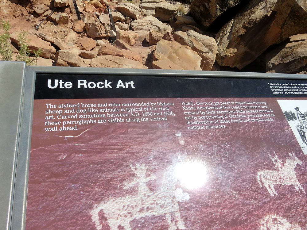 デリケートアーチの駐車場からデリケートアーチのトレイルを少し歩き始めてすぐに2つ目の横道を左に入ったところにあります。私たちはハイキングを終えたあと余力があったので立ち寄ってみました。この岩絵は1650年から1850年の間、原住民の祖先によって描かれたそうで、Ute Rock Artと呼ばれています。岩絵にはビックホーンシ―プや馬に乗る人が生き生きと描かれています。これに似た岩絵はキャピタルリーフ国立公園でも目にしましたが、こちらのほうがはっきりと残されていました。 時間があったら立ち寄って見てください。岩絵の近くにはここに住んでいた人の古い家や納屋が残されています。