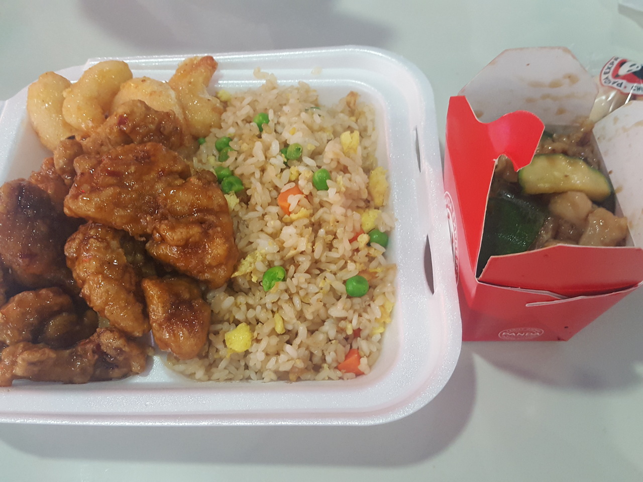フードコートで食べました。チャーハンとその他におかずを3種類選びシェアして食べました。選らんでる時にいくつか味見をさせてくれるので選びやすかったです。選らんだのは口コミでオススメだったオレンジチキンとエビ、ブロッコリーとチキンのお総菜。エビがおいしかった♪チャーハンは食べれなかった(^-^;