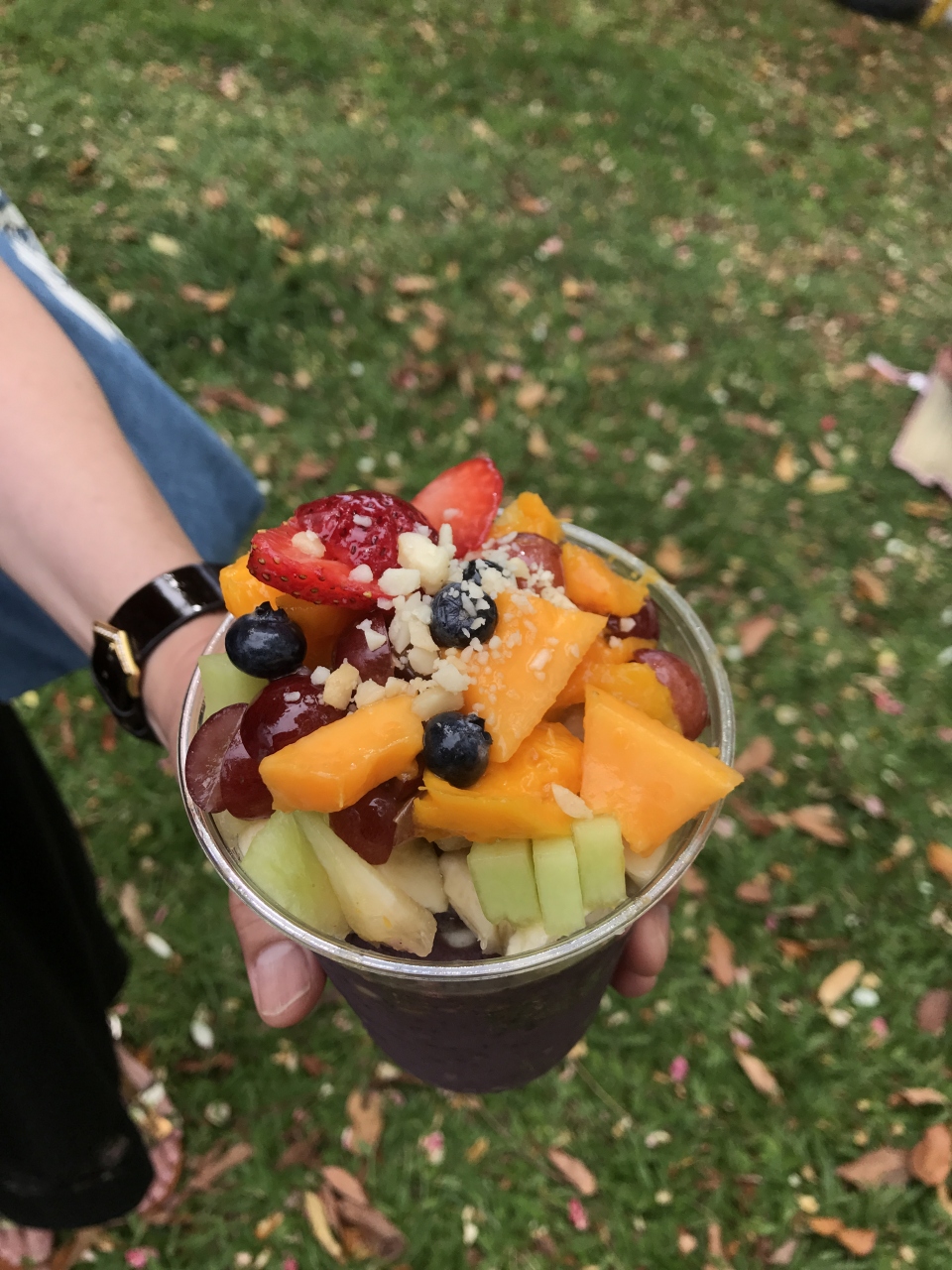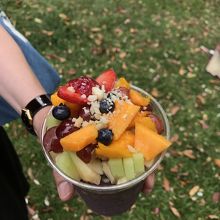 他にも美味しそうな物を買い、会場の隅にゴザを敷いてのんびりと食べました。木や芝生の自然に囲まれた大学の駐車場内なので一層美味しく感じます。