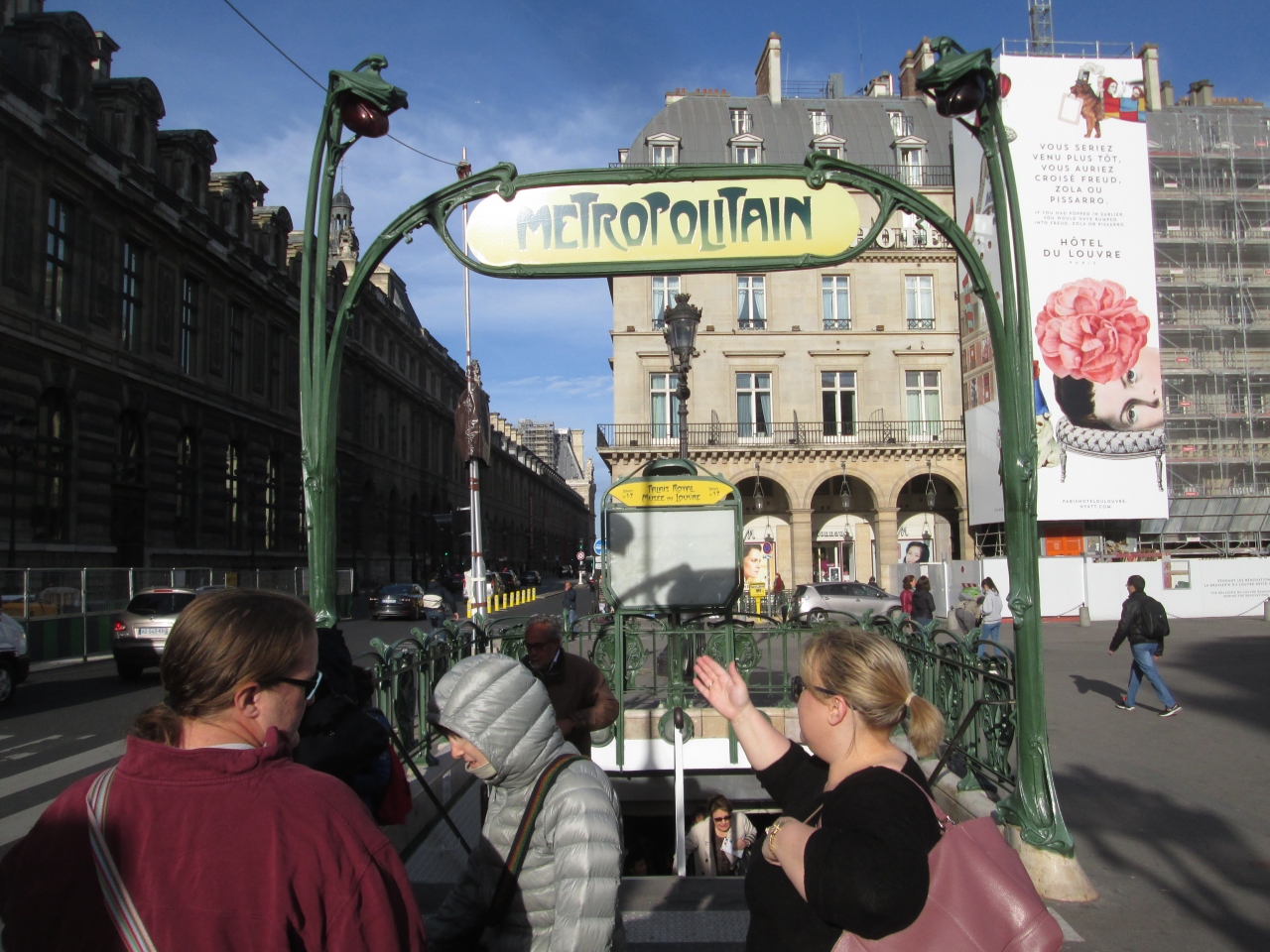 パリメトロ1号線の駅で前後の駅はテュイルリーとルーヴル・リヴォリで、7号線が乗り入れていました。ルーヴル美術館の最寄り駅のひとつで、駅を出て地下のショッピングモールを通り、美術館に入るもよし、地上に出て中庭のガラスのピラミッドから入館することもできました。