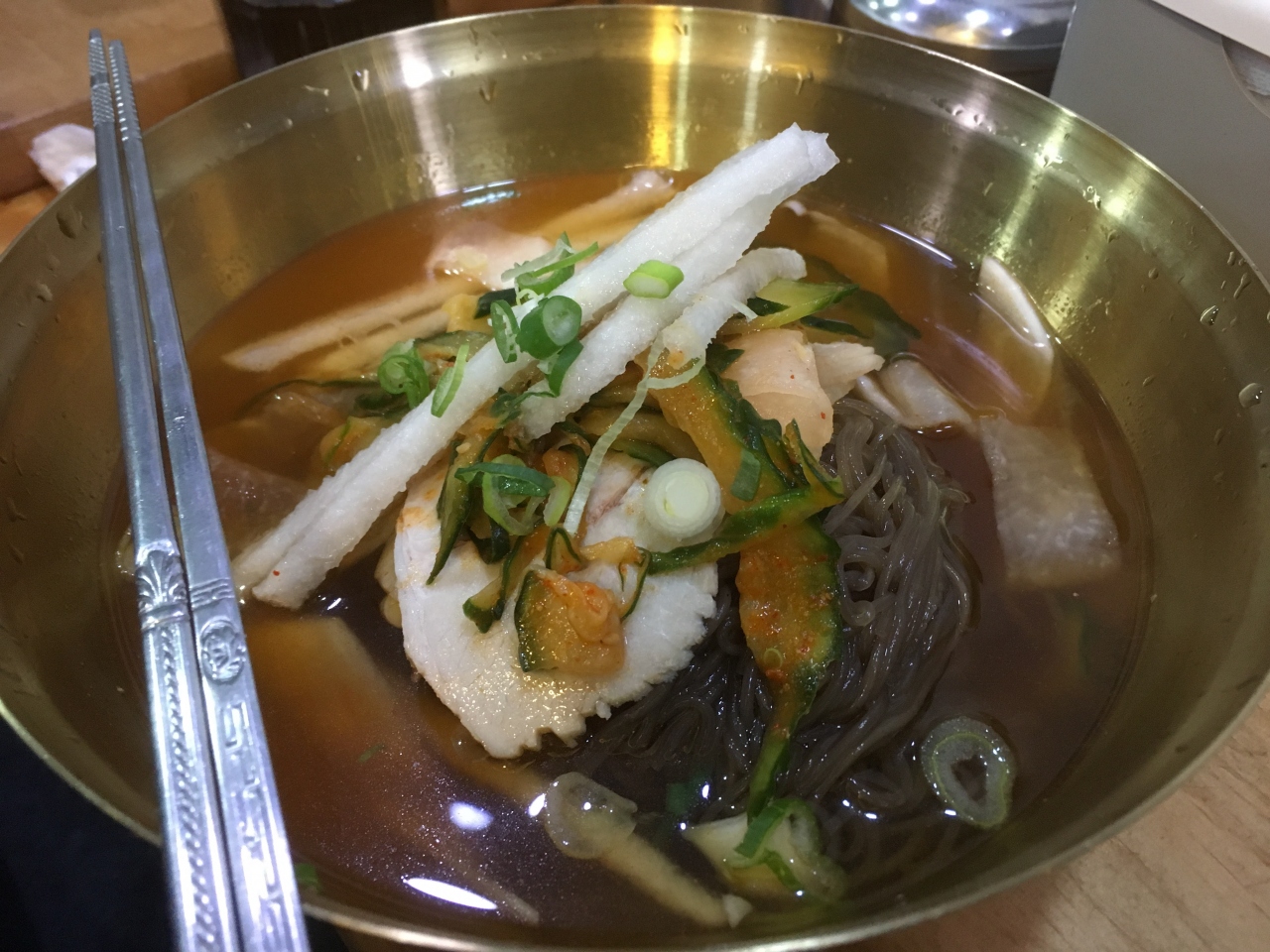ランチに、ビールと、巨大餃子みたいなものと、冷麺を食べて15000ウォンぐらいだったと思います。店内にやかんがおいてあるのですが、これが実はスープで美味。もちろん、冷麺もおいしいです。辛い冷麺とからくない冷麺がありますが、どちらでもおいしいです。